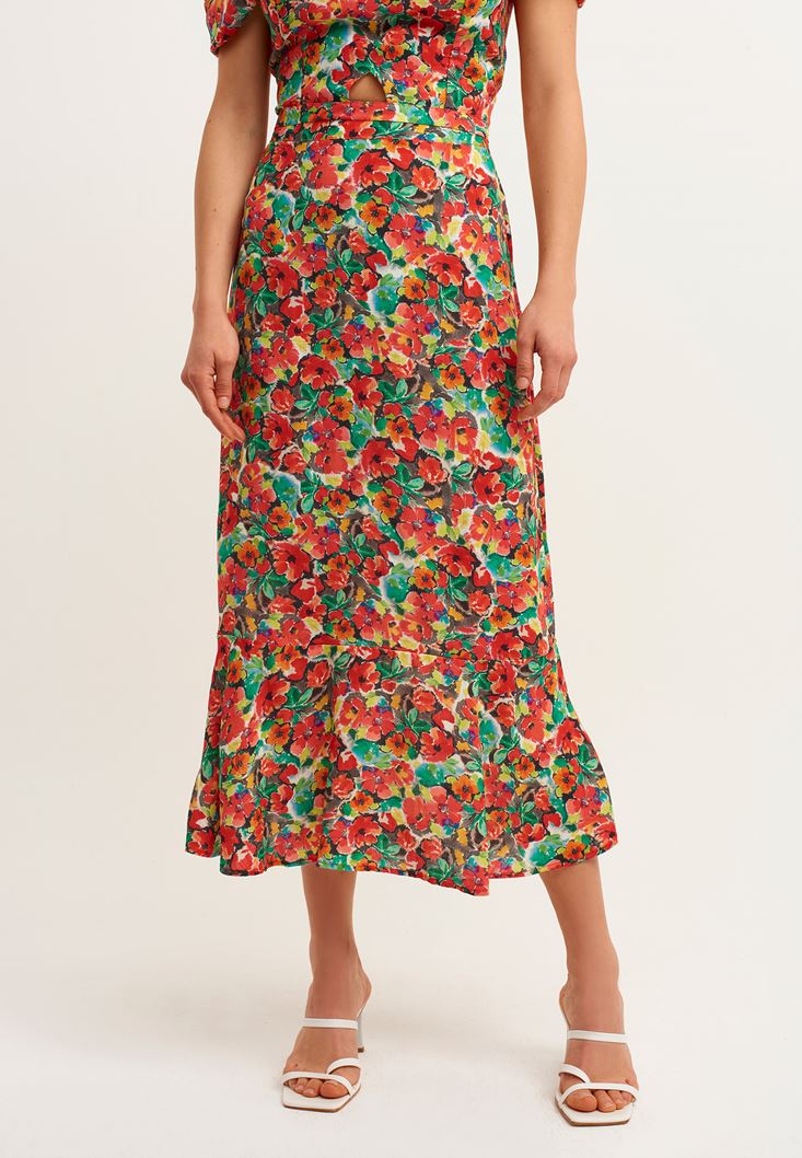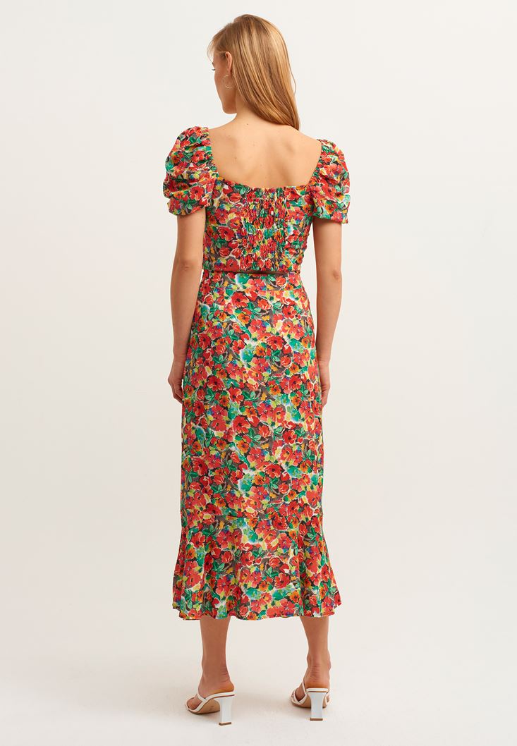 Çok Renkli Floral Desenli Volanlı Midi Etek