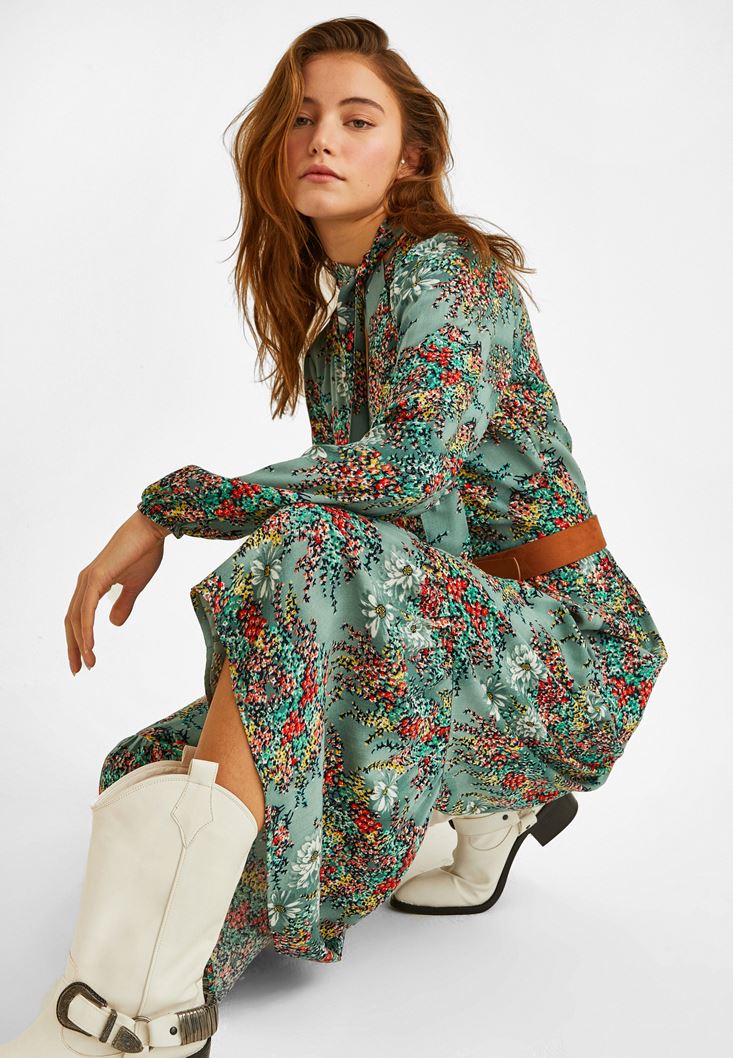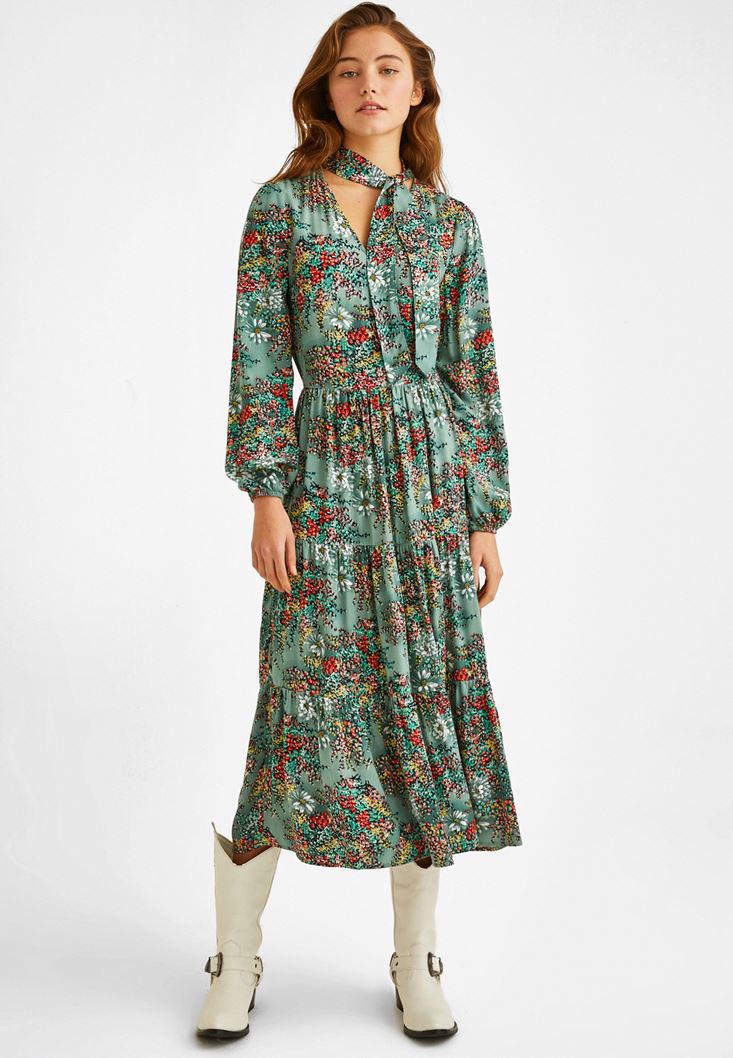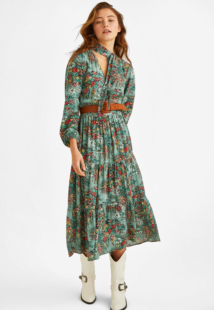 Fular Detaylı Midi Boy Elbise modeli, viskon içerikli hoş dokusu ve desenli görünümü ile yeni sezona hareket katıyor. Kadın elbise modeli, fular detayı ve katlı etek ayrıntısı ile Oxxo'da sizlerle buluşuyor. Midi boy elbise modeli ile hem günlük kombinlerinizi hem de özel davetlerdeki şıklığınızı tamamlayabilirsiniz. Topuklu ayakkabılarla ve askılı çantalarla bir araya getirebileceğiniz kadın elbise modeline dolabınızda yer açabilirsiniz. Oxxo'nun midi boy elbise modelleri ile siz de tarzınıza farklı ve dikkat çekici dokunuşlar yapabilirsiniz.