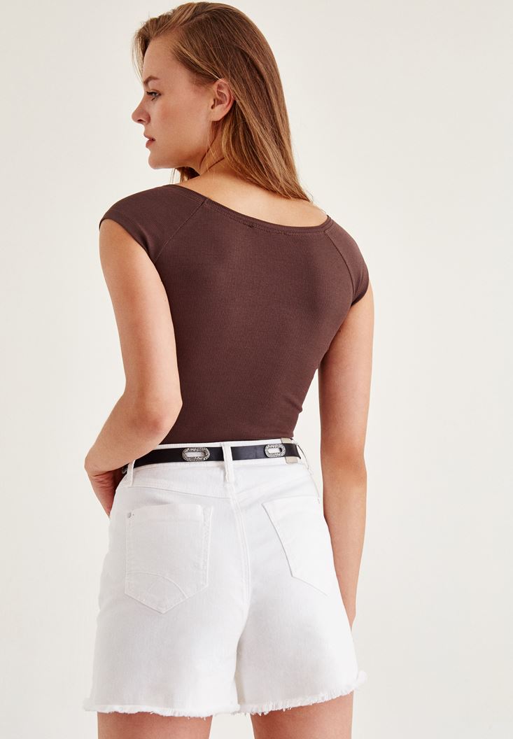 Kahverengi Geniş Yakalı Kısa Kollu Tişört