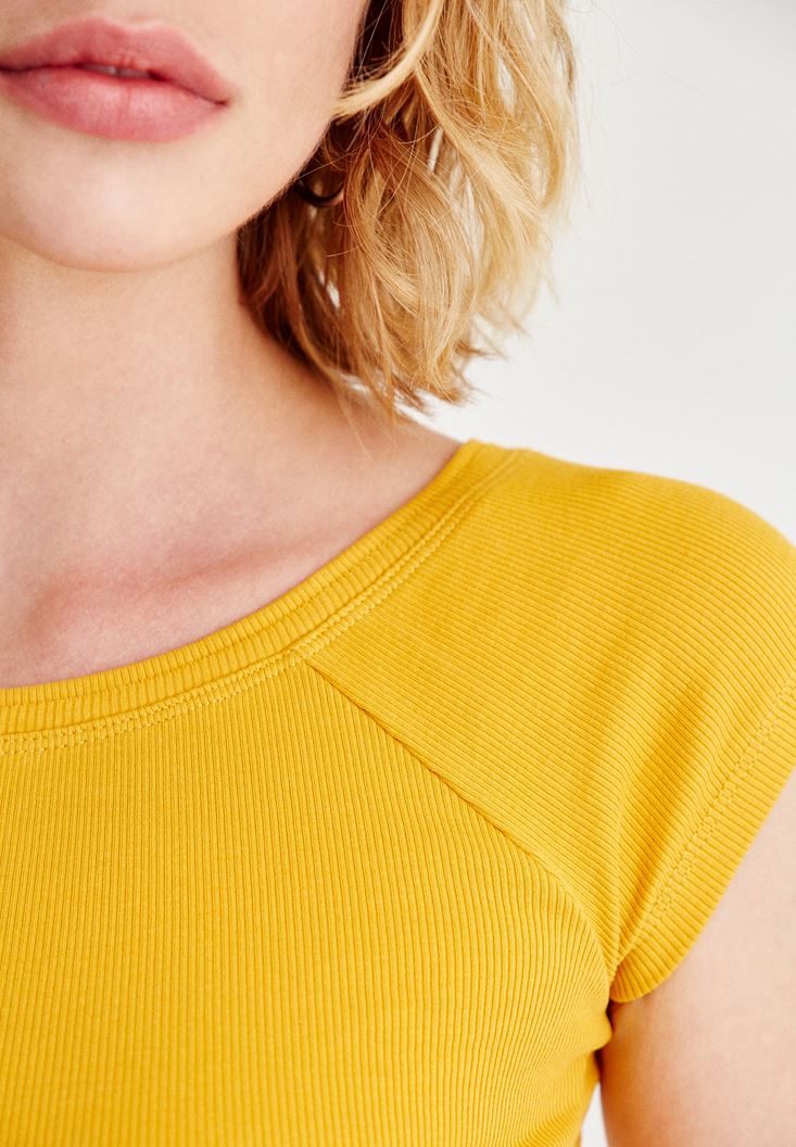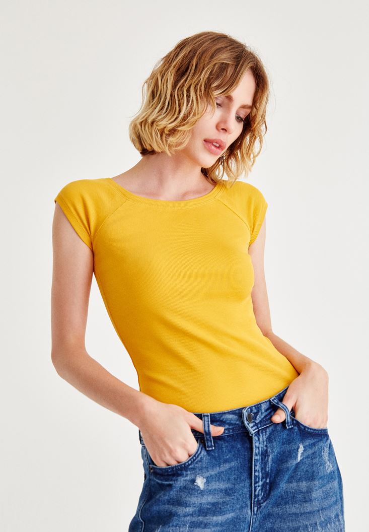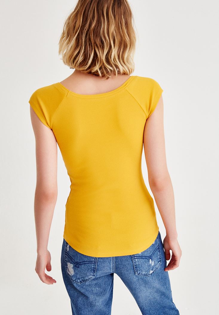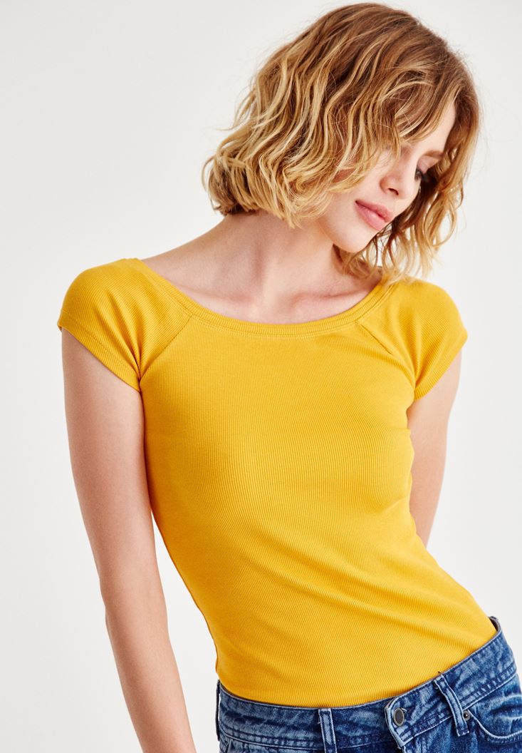 • Bayan Sarı Geniş Yakalı Kısa Kollu Tişört