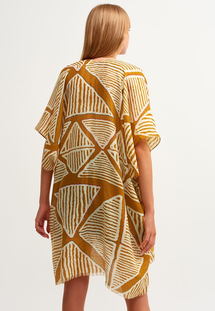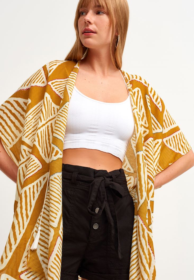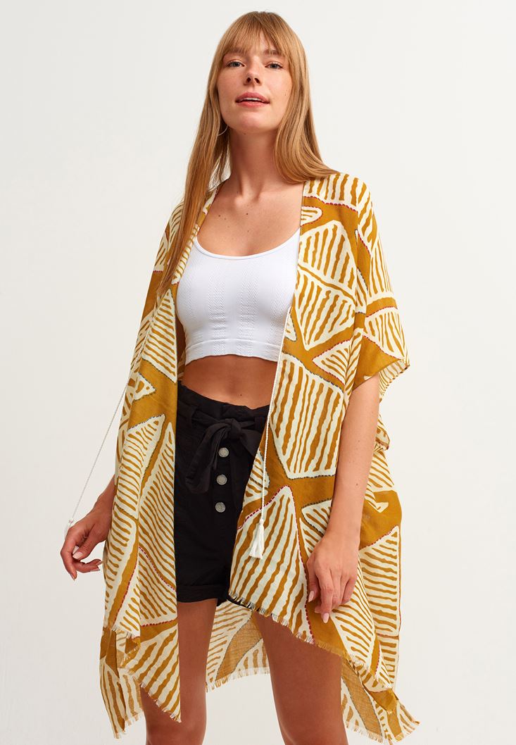 Geometrik Baskılı Midi Kimono modeli. Uçuş uçuş yapısı ve desenleri ile seni büyülemeye hazır olan kimono ile tanış! Güneşli günler için oluşturacağın canlı görünümlere veya plaj kombinlerine onu dahil edebilirsin. Vurgulu desenleri ile ön plana çıkan midi kimono modelinin el yapımı makrome çantalarla yaratacağı doğal etkiyi yakından görmelisin. :)