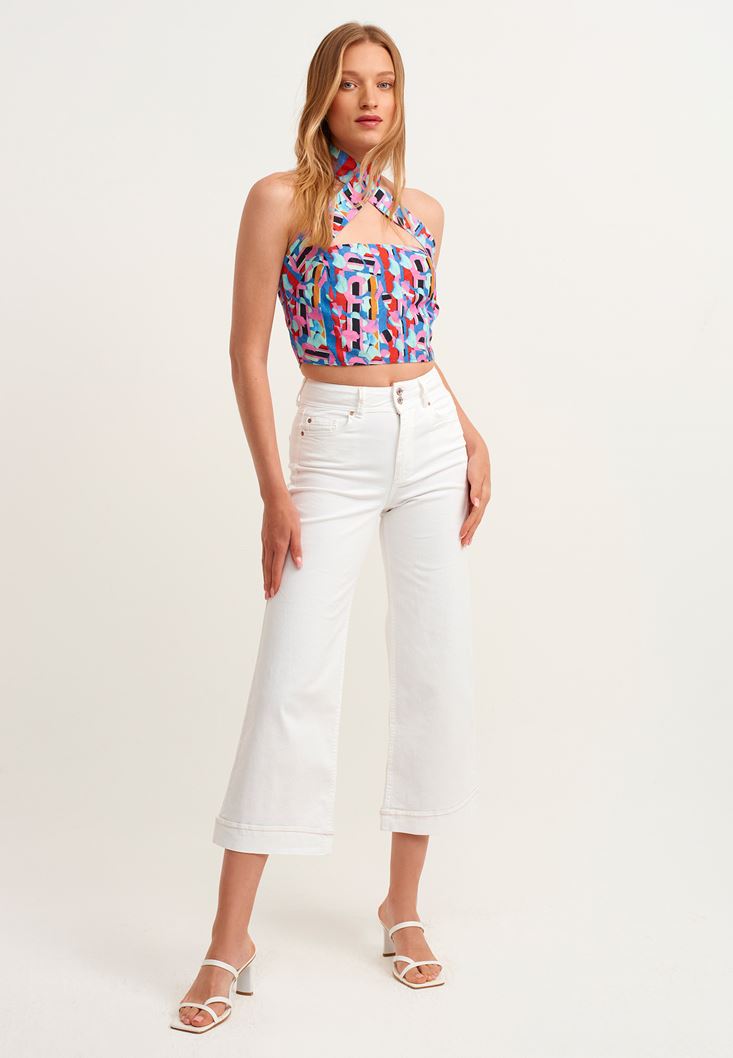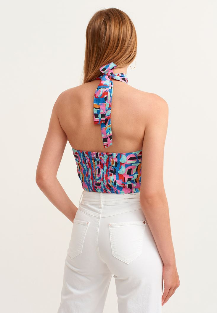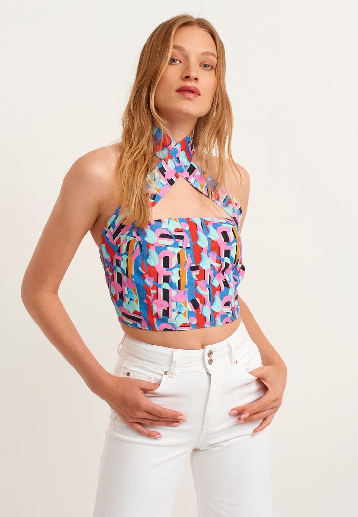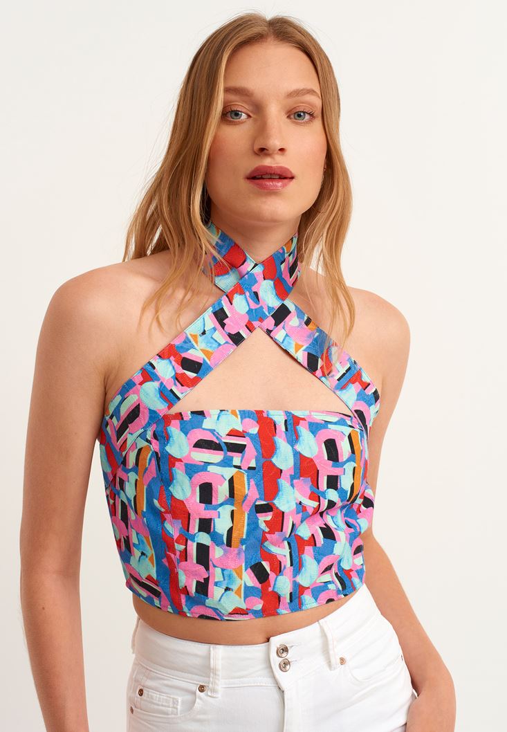 • Bayan Çok Renkli Geometrik Desenli Crop Bluz