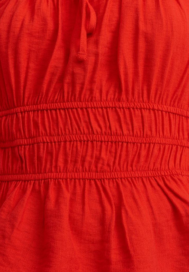 Viskon karışımlı özel doku, kare yaka form, kalın askılı, beli saran gipe detayı, yaka kısmı bağcıklı.