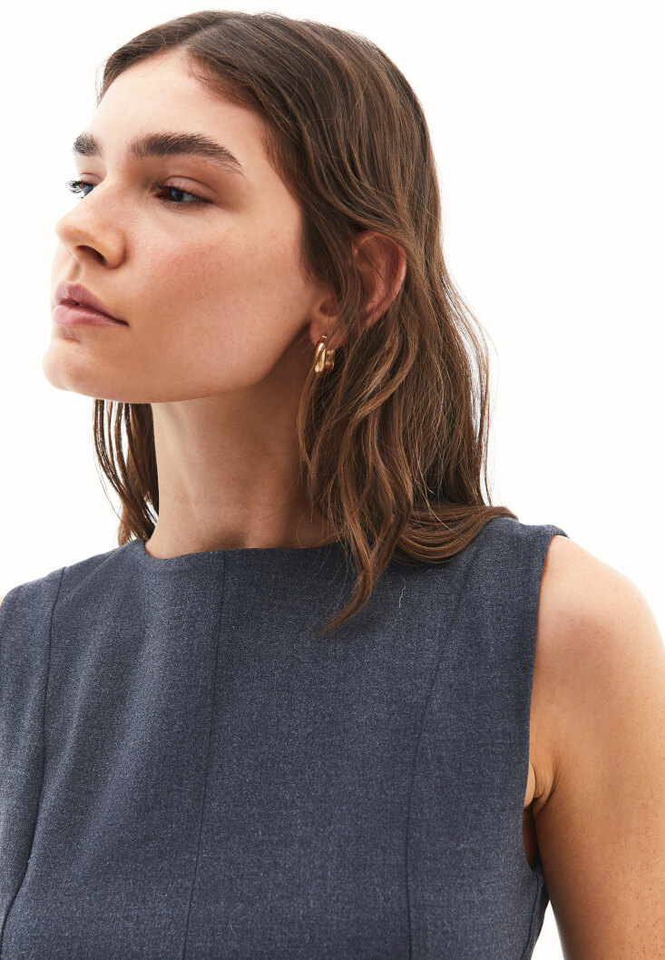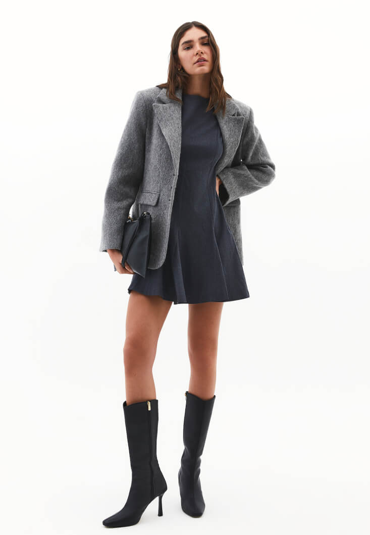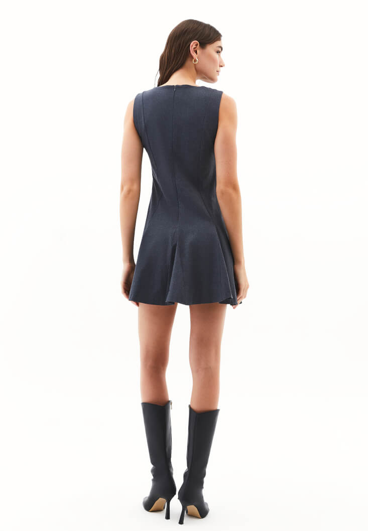 Sıfır yaka ve kolsuz kesimiyle modern bir duruş sunan bu mini elbise, godeli formuyla hareketli ve feminen bir silüet oluşturur. Yumuşak dokulu kumaşıyla gün boyu konfor sağlarken, zamansız tasarımı sayesinde dolabınızın joker parçaları arasına girer.
