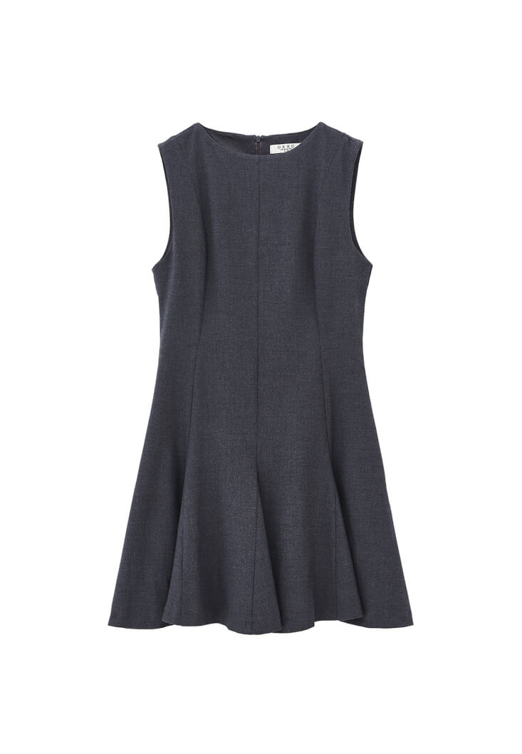 Viskon karışımlı özel doku, bedene yakın esnek fit, sıfır yaka, kolsuz tasarım, volanlı etek, ense kısmı fermuar kapamalı, mini boy.