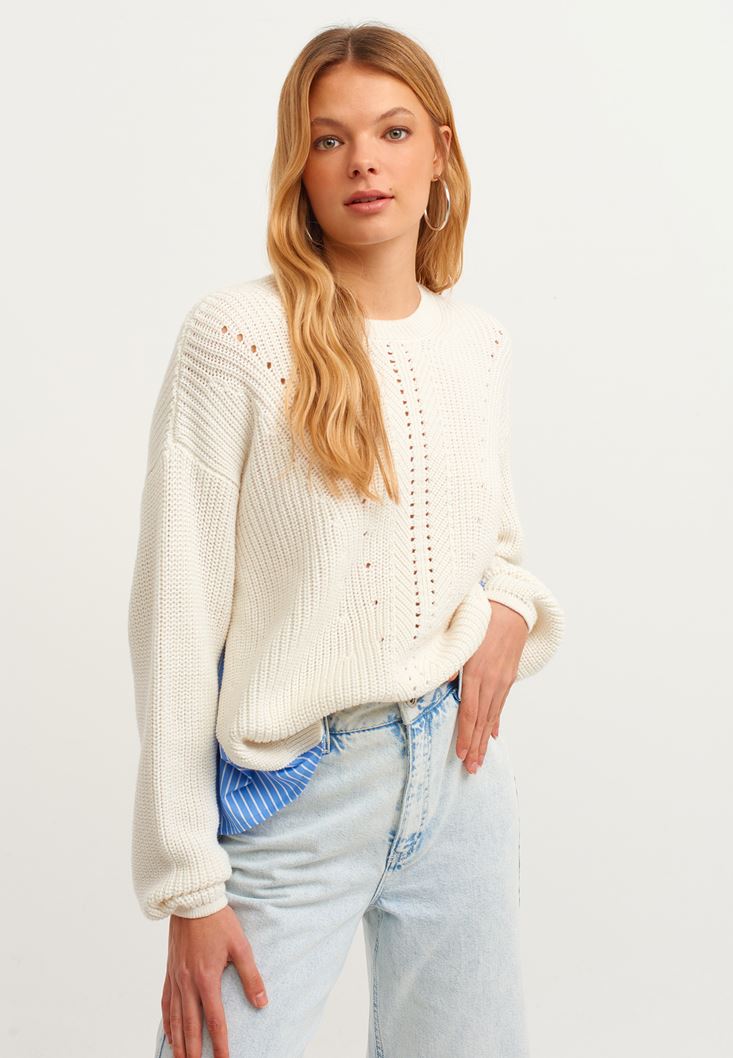 • Bayan Krem Gömlek Detaylı Pamuklu Triko Kazak