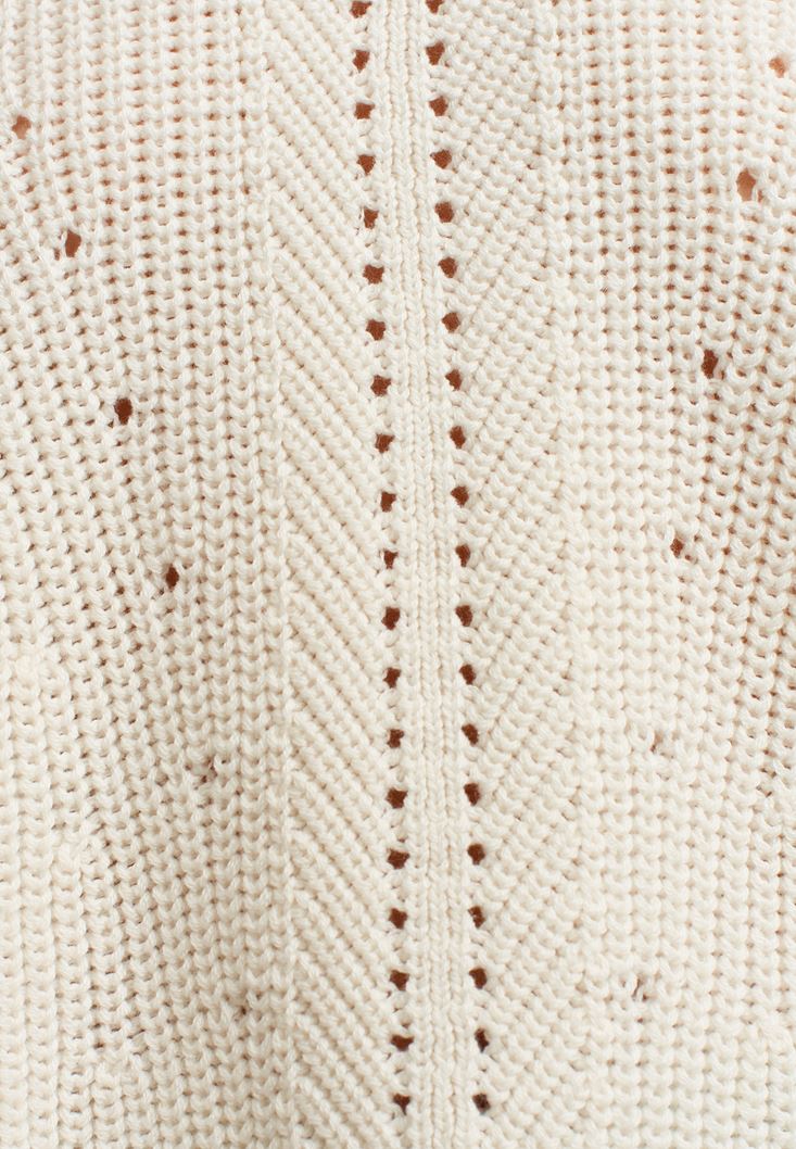 Pamuk karışımlı triko, ön kısmı ajurlu örgü, yanları gömlek ve bağlama detaylı, sıfır yala, bedenden uzak rahat fit, uzun kollu.