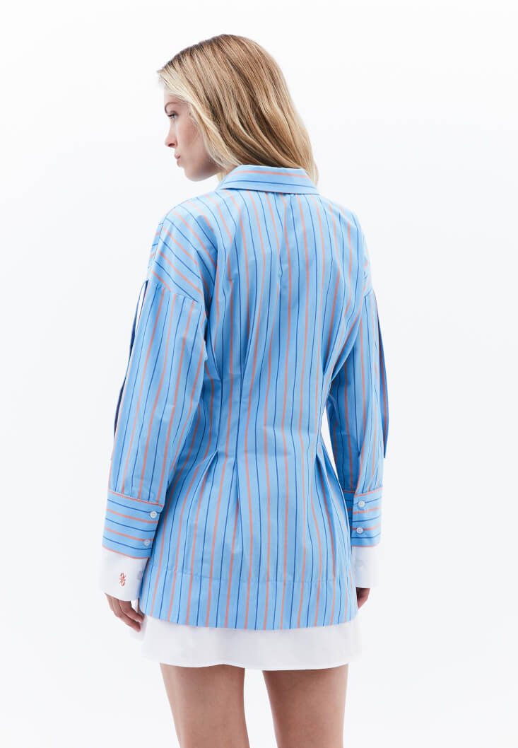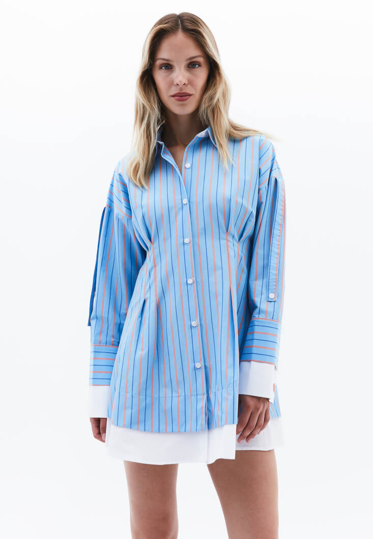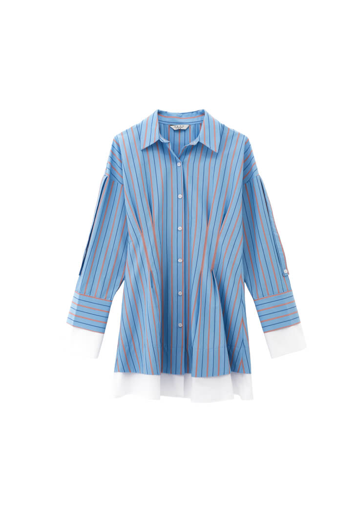 Pamuk karışımlı özel doku, çizgi desenli, mini boy, düğme kapamalı, manşet ve etek kısmı katmanlı, bel kısmı bedene yakın, uzun kollu, kol bölümü uzun apolet detaylı.