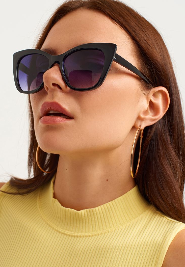 Güneş Gözlüğü modeli. UV filtreli koruma güneşli günlerde seninle olsun! Kombinleri birkaç adım öne taşıyabilen güneş gözlüğü favorin olmaya aday... Cat eye formun geniş çerçeve ile birleştiği bu parçayı renkli fularlar ve sallantılı küpeler ile birleştirmek için zaman kaybetme, o seni bekliyor!