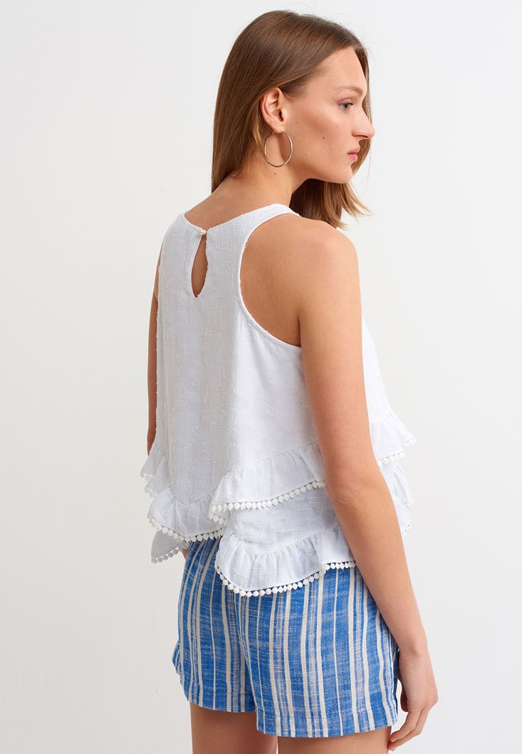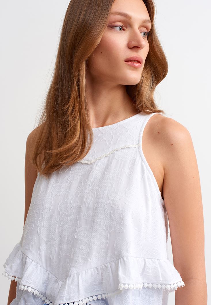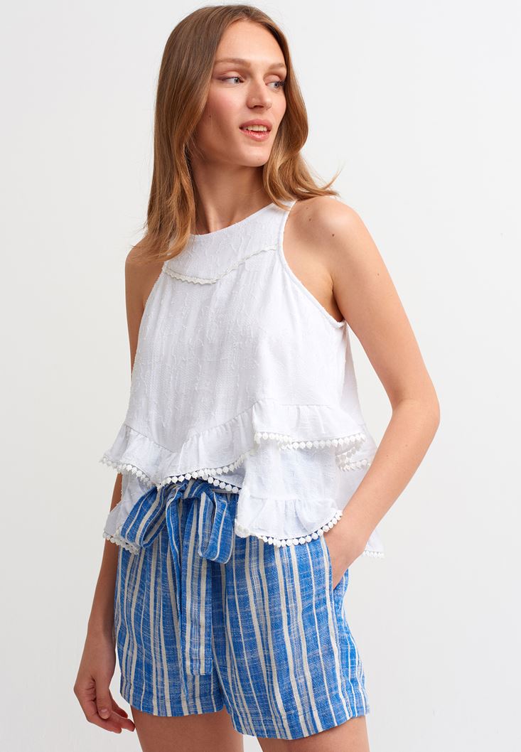 Halter Yaka Bluz modeli. Pamuk ve viskon içeriğin bir araya geldiği bu parça halter yaka formu ile karşında. Kadın bluz modeli, alt kısmındaki asimetrik kesimin fırfır detayları gününü hareketlendirmek için çok uygun... Günlük kombinlerinde kullandığın skinnylerle veya bol pantolonlarla onu buluşturmak isteyebilirsin. Şimdi bir kadın bluz modelinde aradığın ayrıntılarla tanışmak için hazırsın.