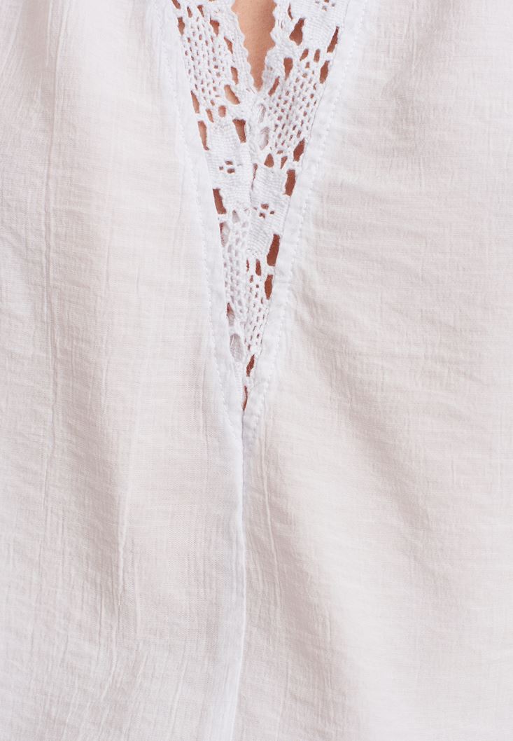 Viskon karışımlı doku, halter yaka, yakası dantel nakışlı, sırt kısmına uzanan boyundan bağlama detayı, beli lastikli.