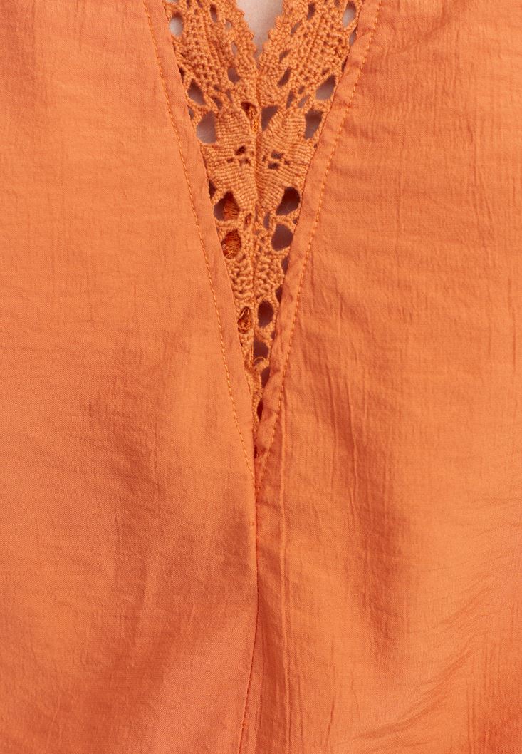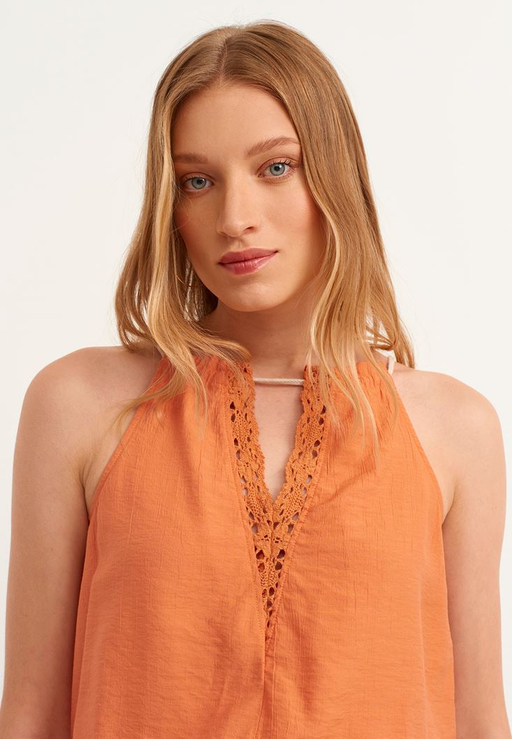 Viskon karışımlı doku, halter yaka, yakası dantel nakışlı, sırt kısmına uzanan boyundan bağlama detayı, beli lastikli.