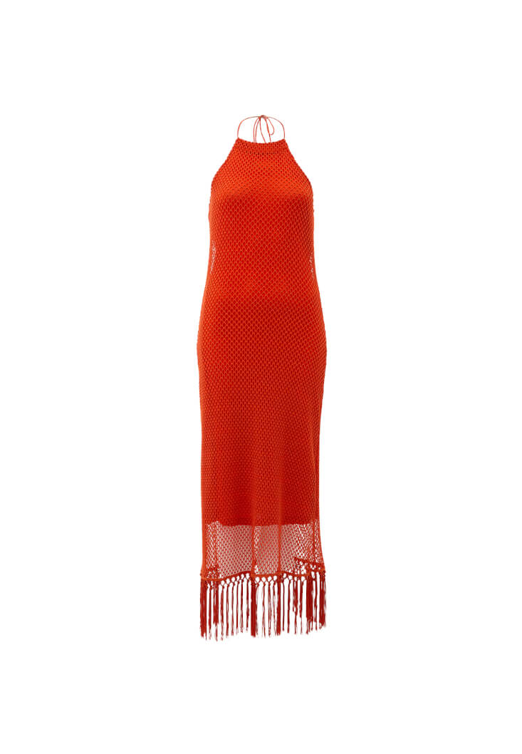 Parıltılı file örgü, bedene yakın fit, halter yaka, boyundan bağlama detaylı, etek ucu püsküllü, içi astarlı.