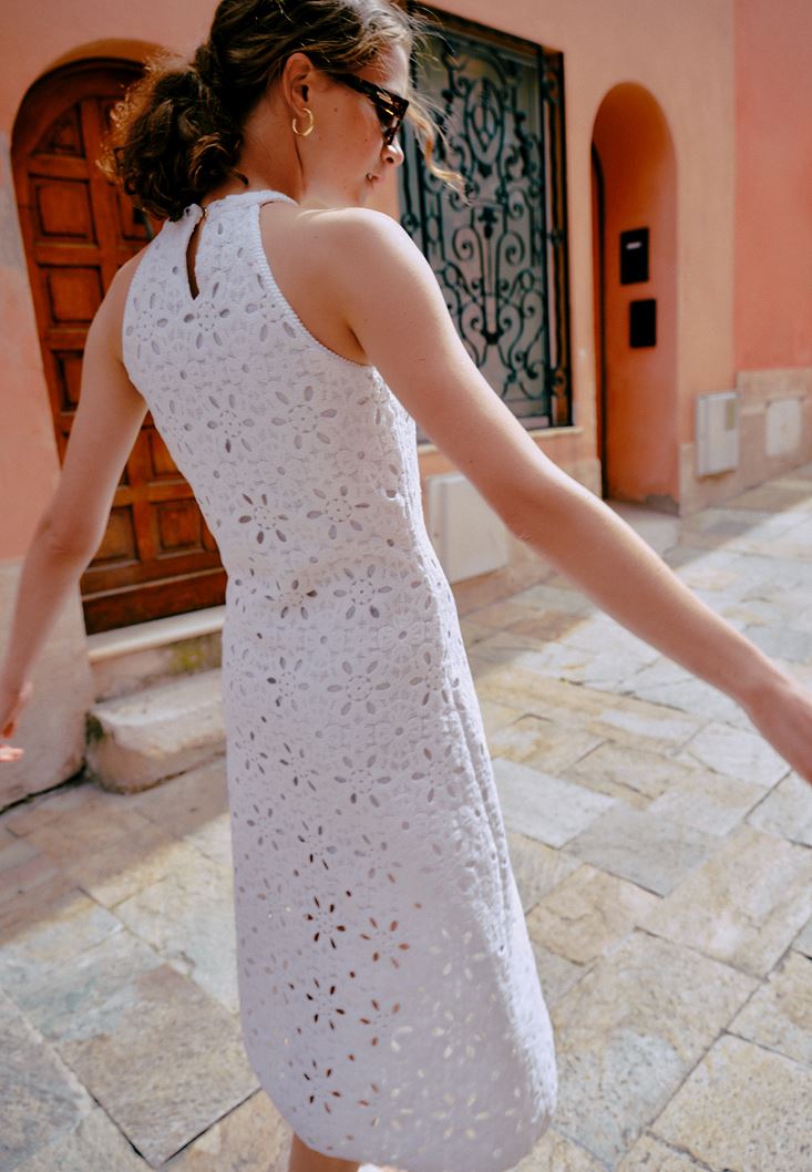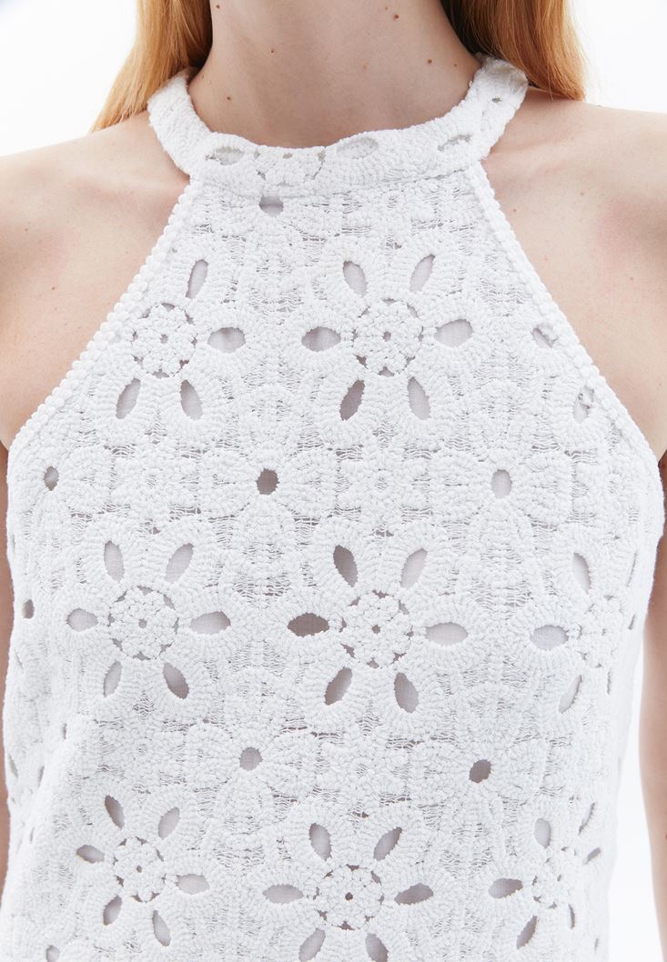 Pamuk içerikli doku, bedene yakın fit, halter yaka, dantel motifli örgü, içi astarlı, midi boy.