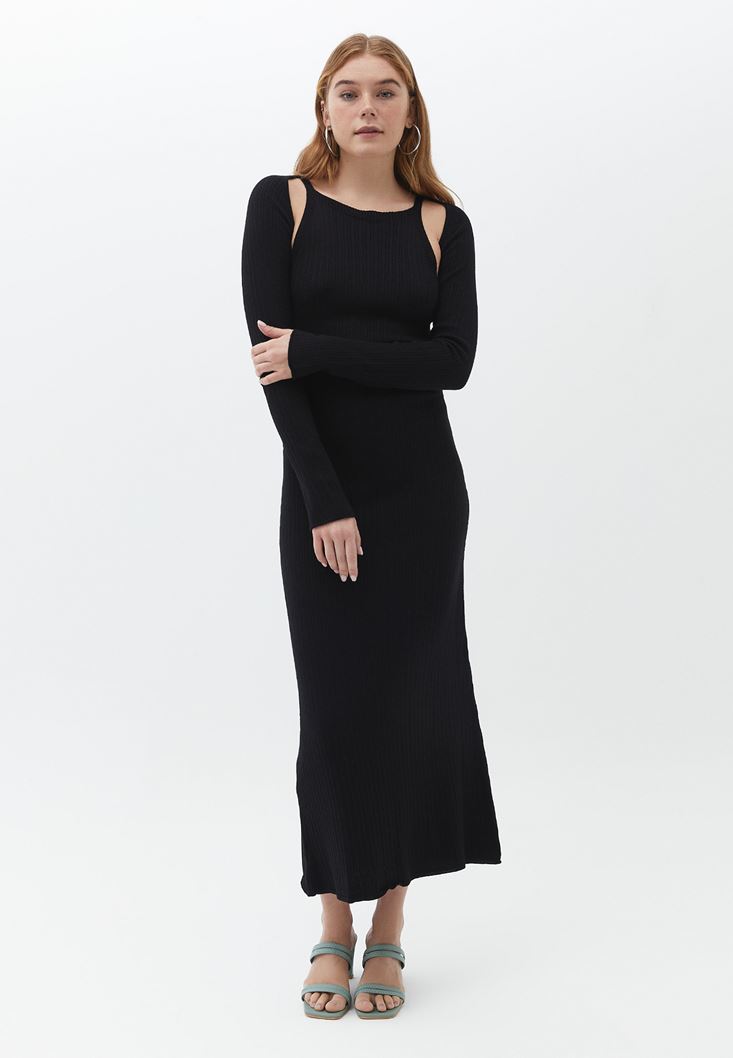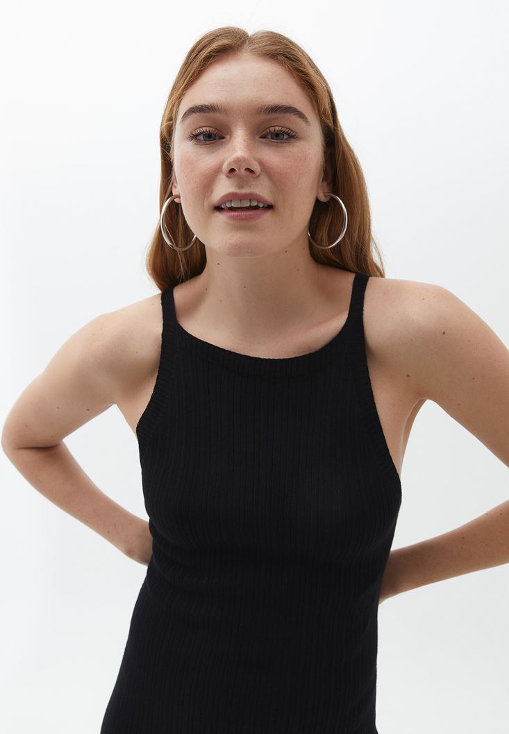 Viskon karışımlı triko doku, halter yaka, ince askılı, bedeni saran esnek kalıp, fitilli örme, ince askılı.