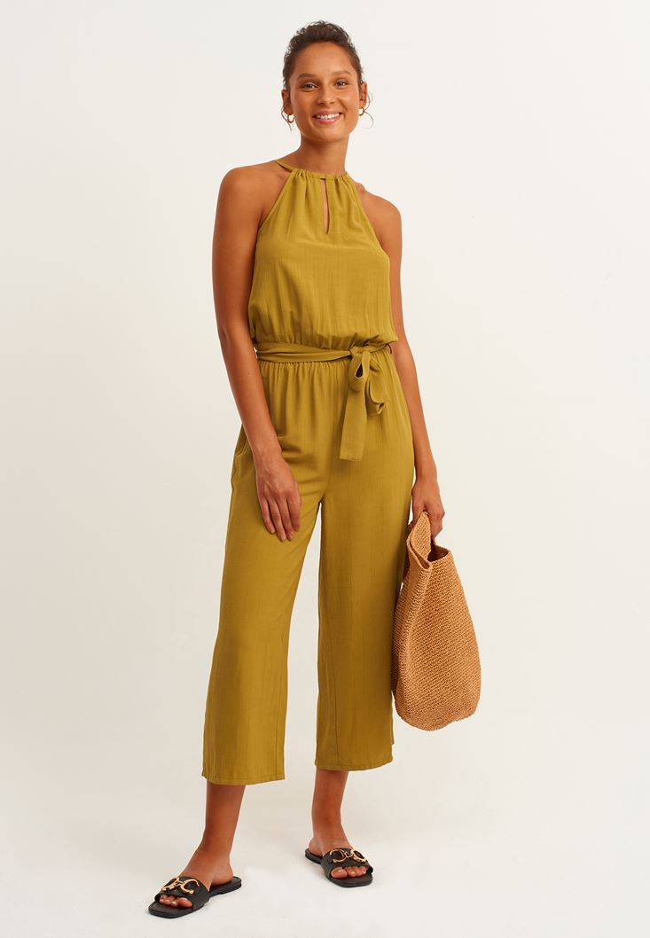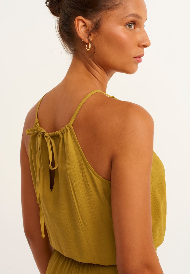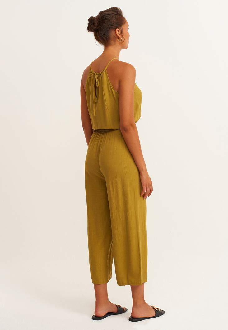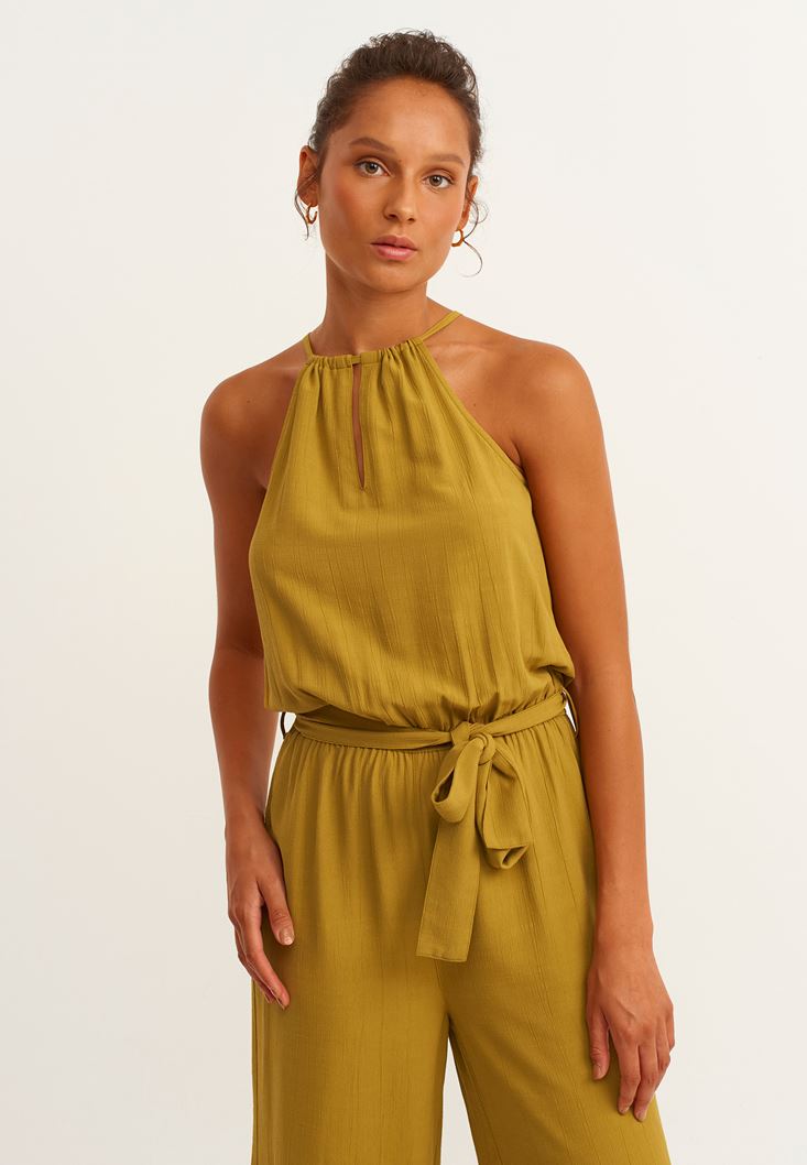 Viskon karışımlı özel doku, bol paça, kendi kumaşından kuşaklı, bağlamalı boyun detayı, halter yaka, göğüs kısmı cut-out detaylı.