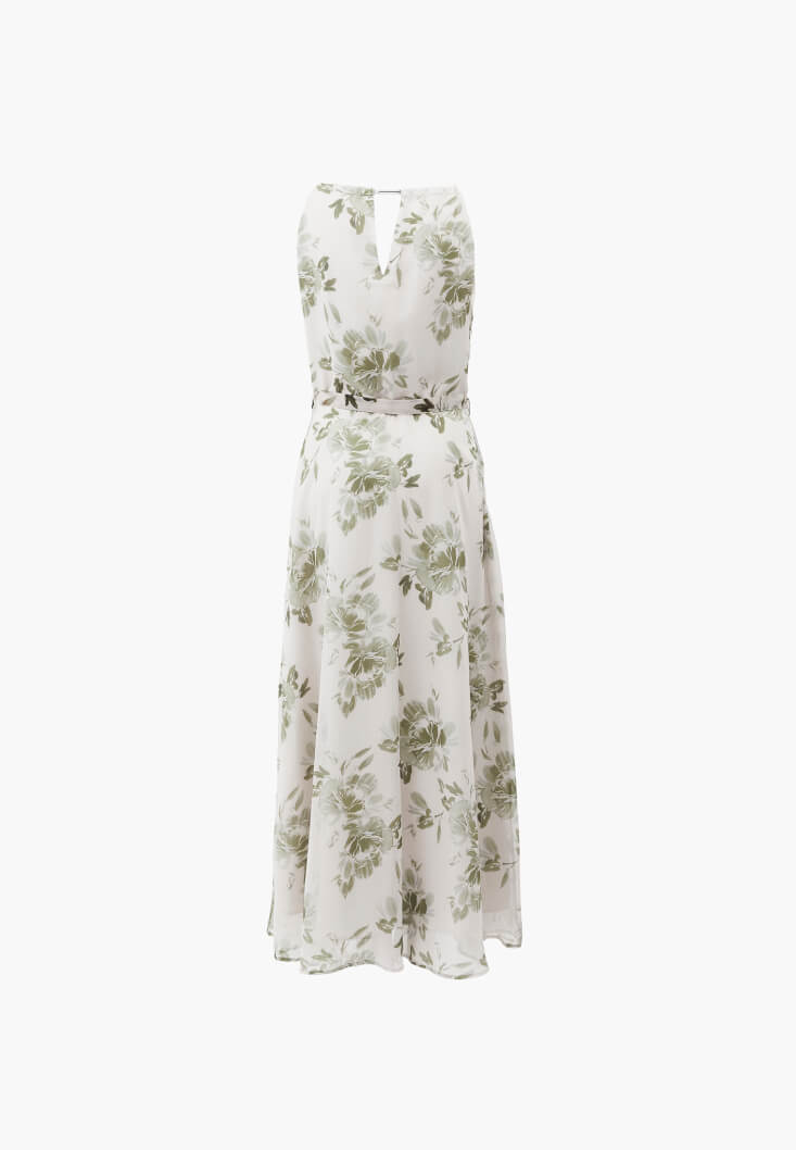 Floral desenli, bedene yakın rahat fit, halter yaka, kendi kumaşından kuşaklı, boyun kısmı bağlama detaylı, a kesim, uzun boy, içi astarlı.
