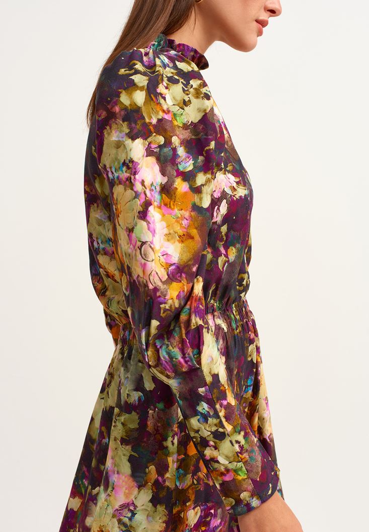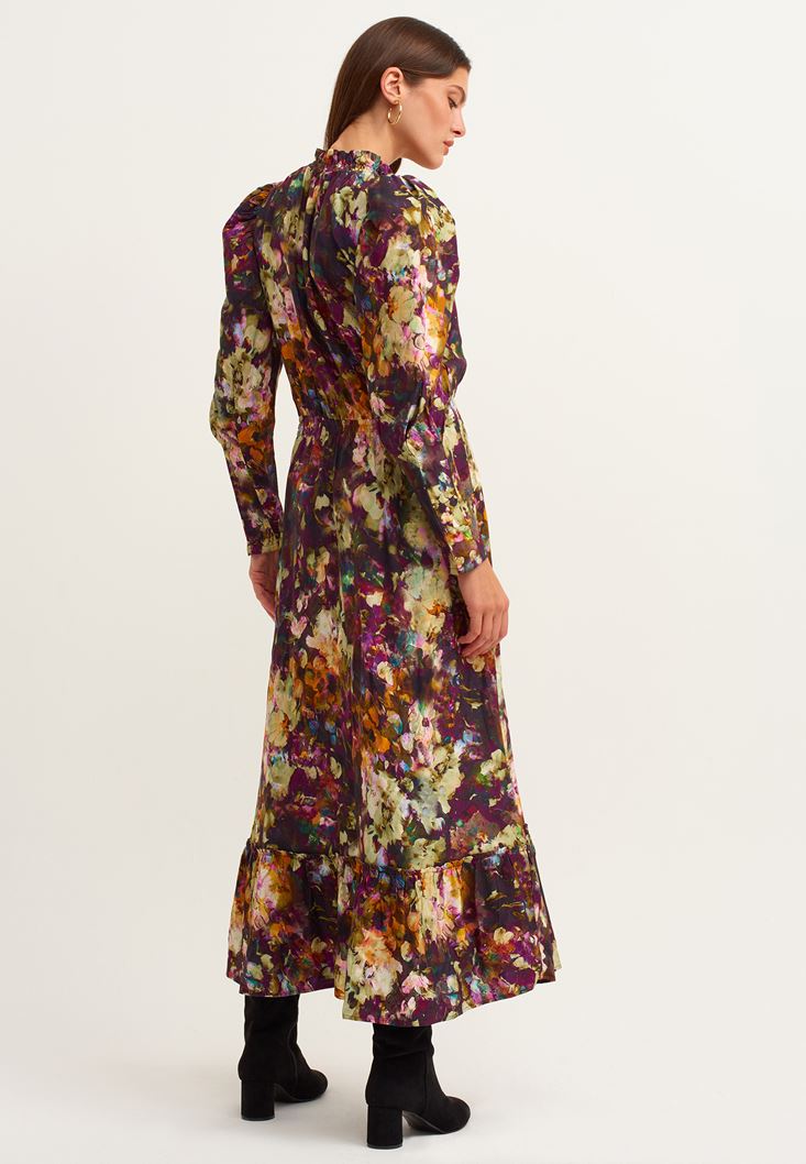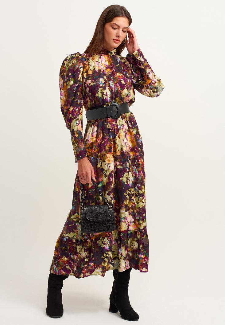 Çok Renkli High-Neck Romantik Esintili Uzun Elbise