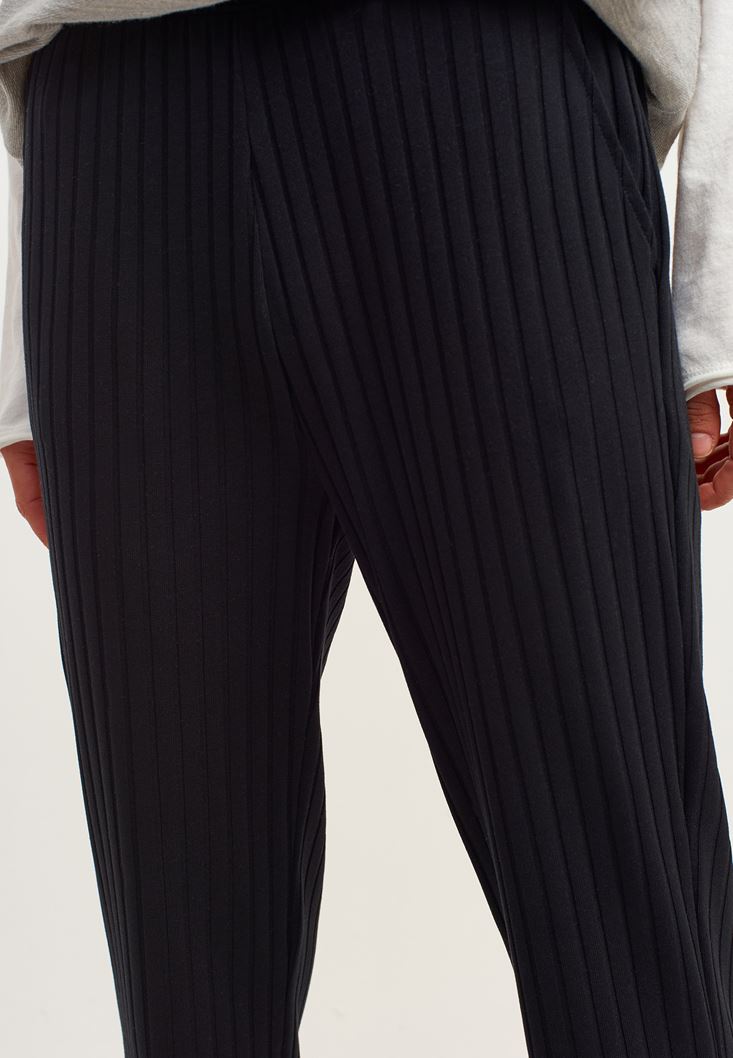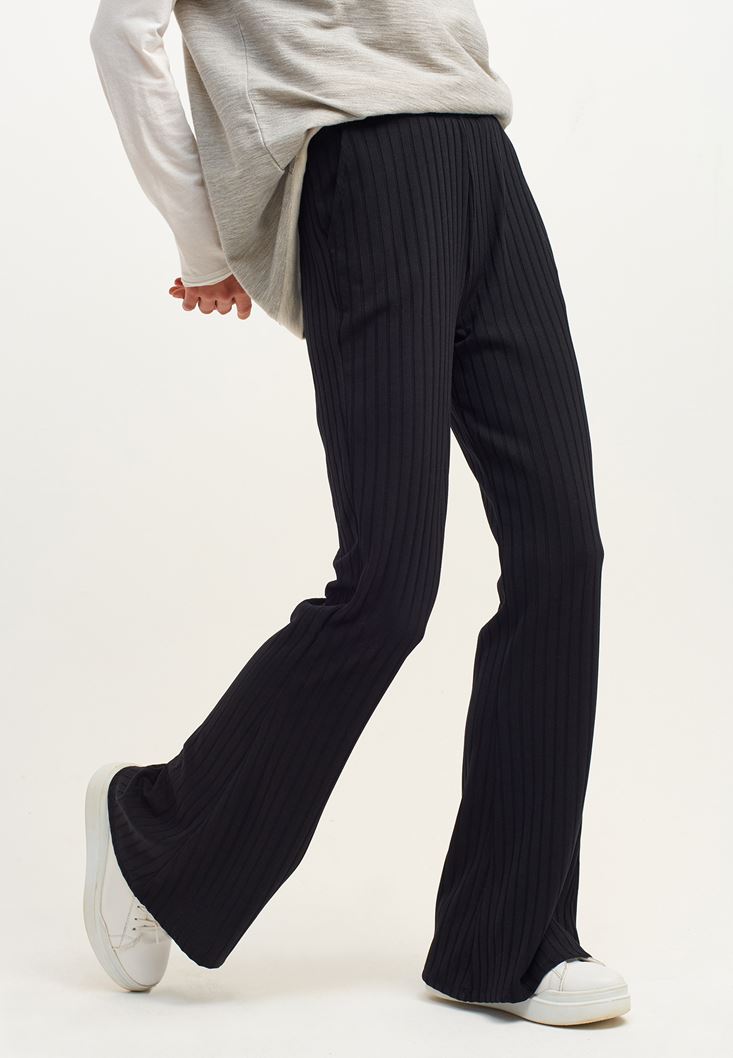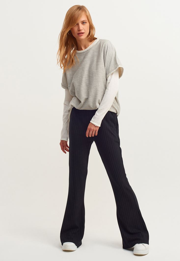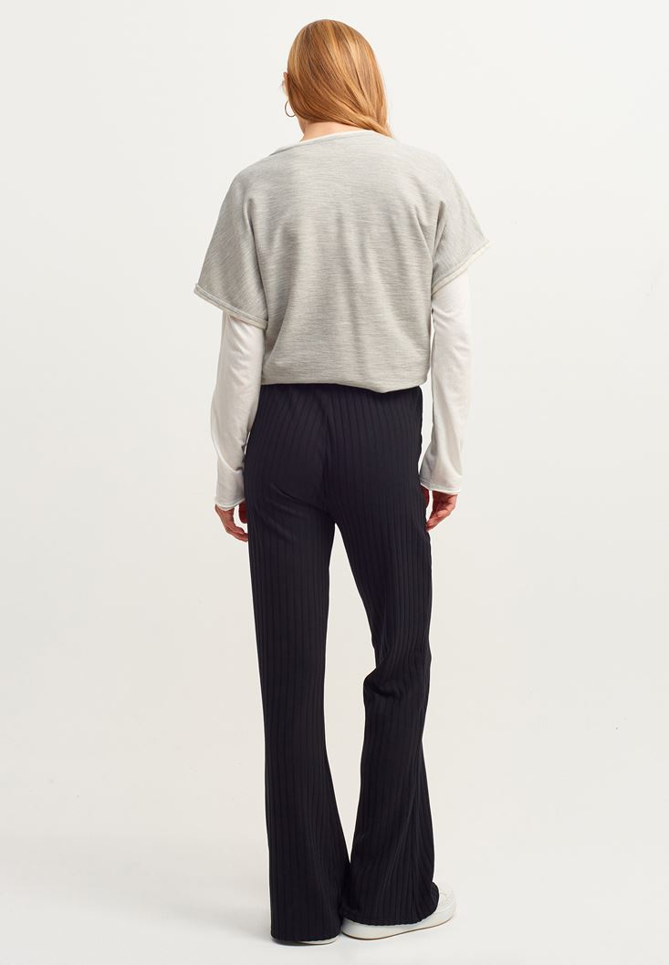 Özel yumuşak ribanalı doku, iki cepli, yüksek bel ve geniş ispanyol paça form.