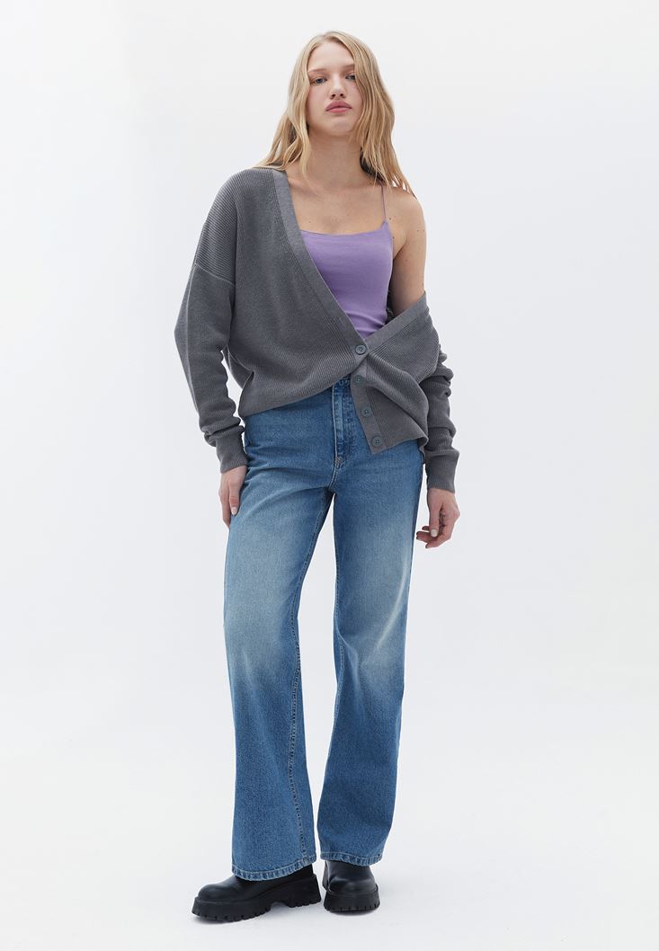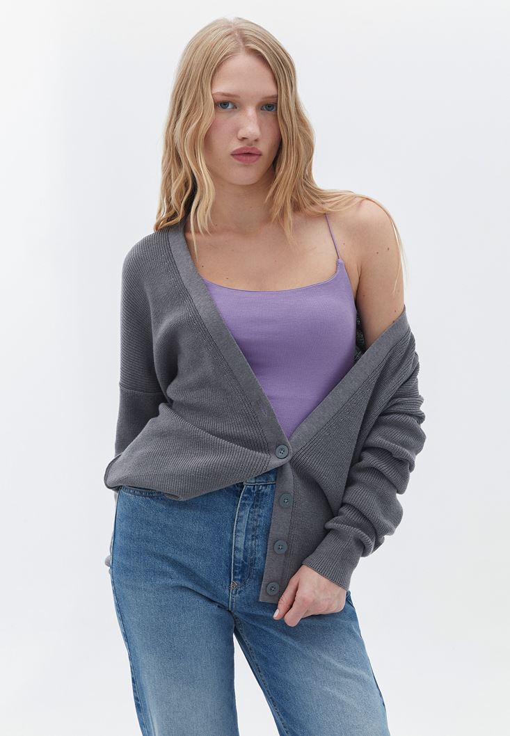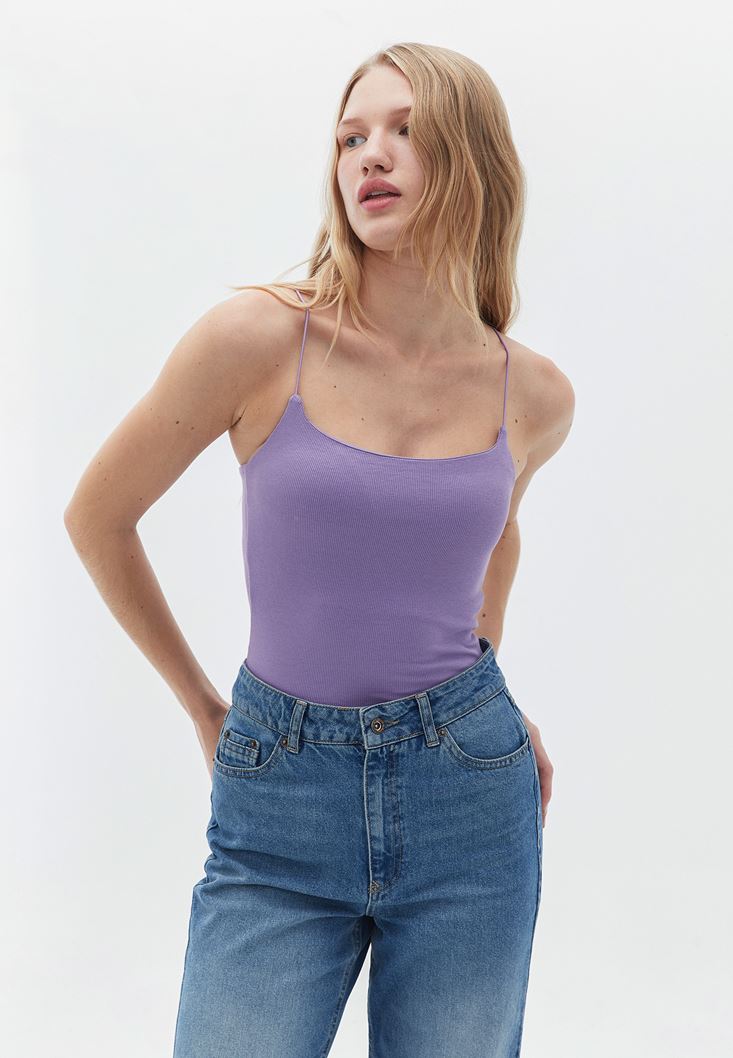 Pamuk içerikli fitilli doku, bedeni saran esnek fit, geniş yaka, standart boy, ince askılı.