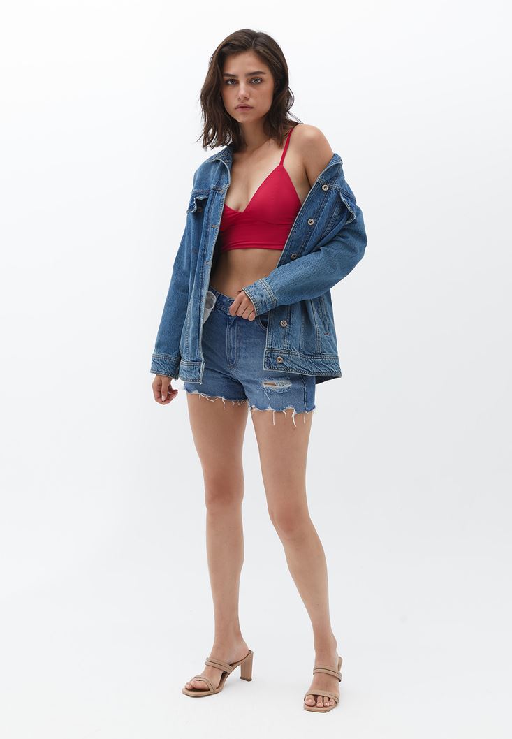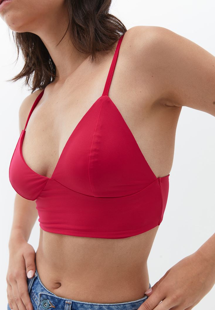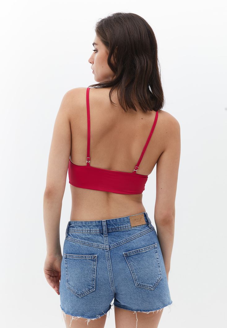 Bedeni saran özel esnek doku, V yaka, ince askılı, crop kesim, ayarlanabilir askı.