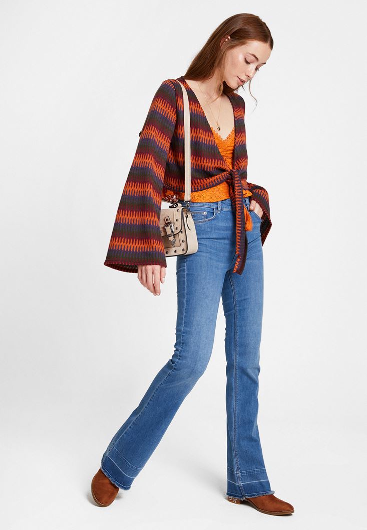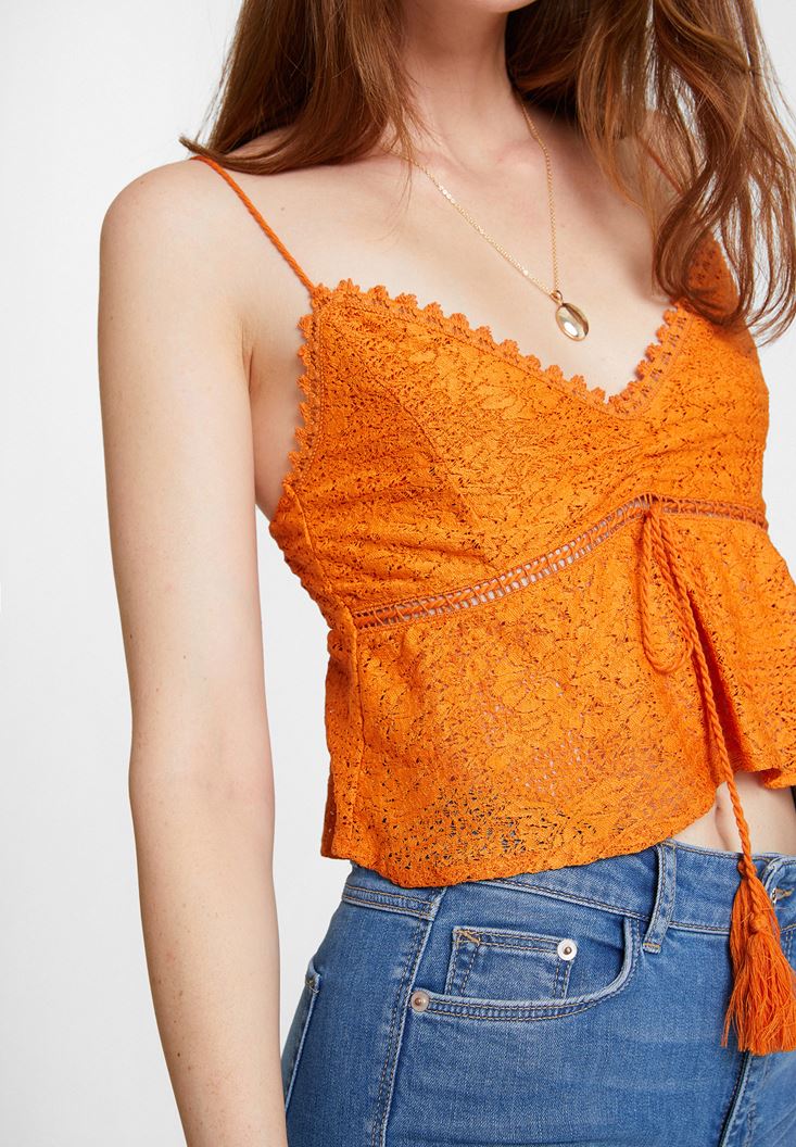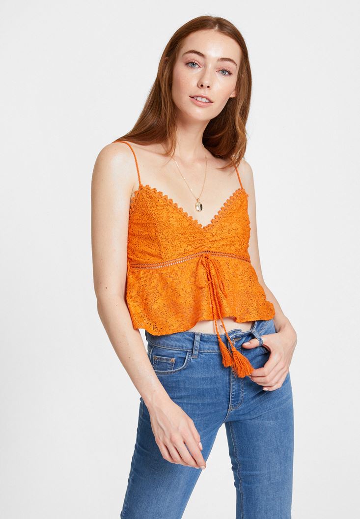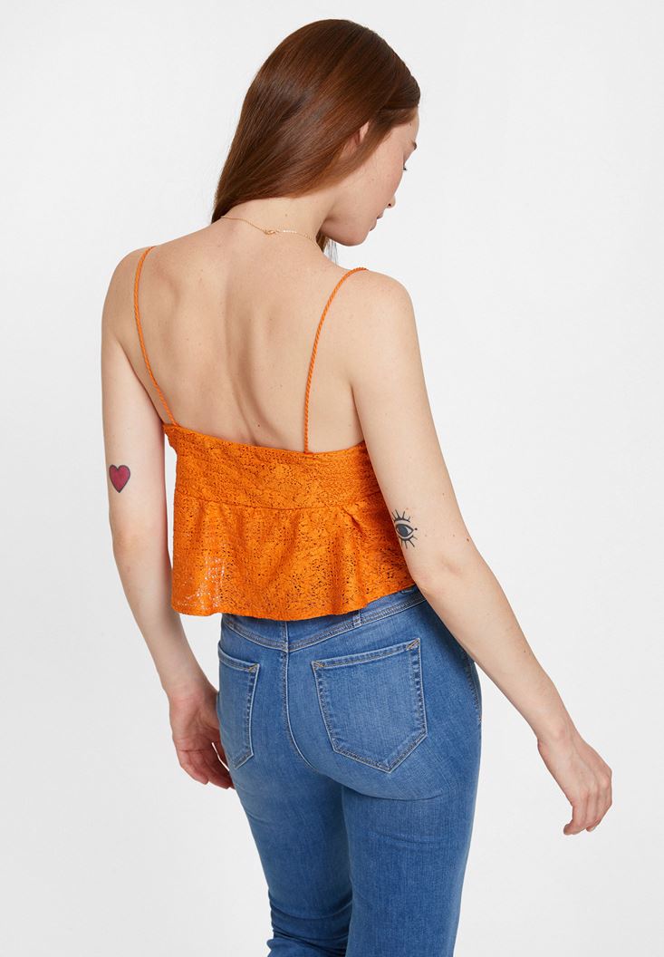 Turuncu İnce Askılı Dantel Detaylı Bluz