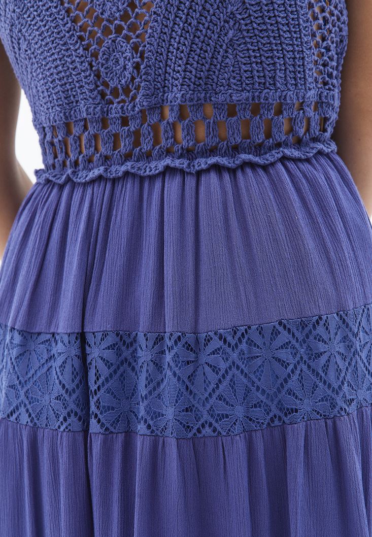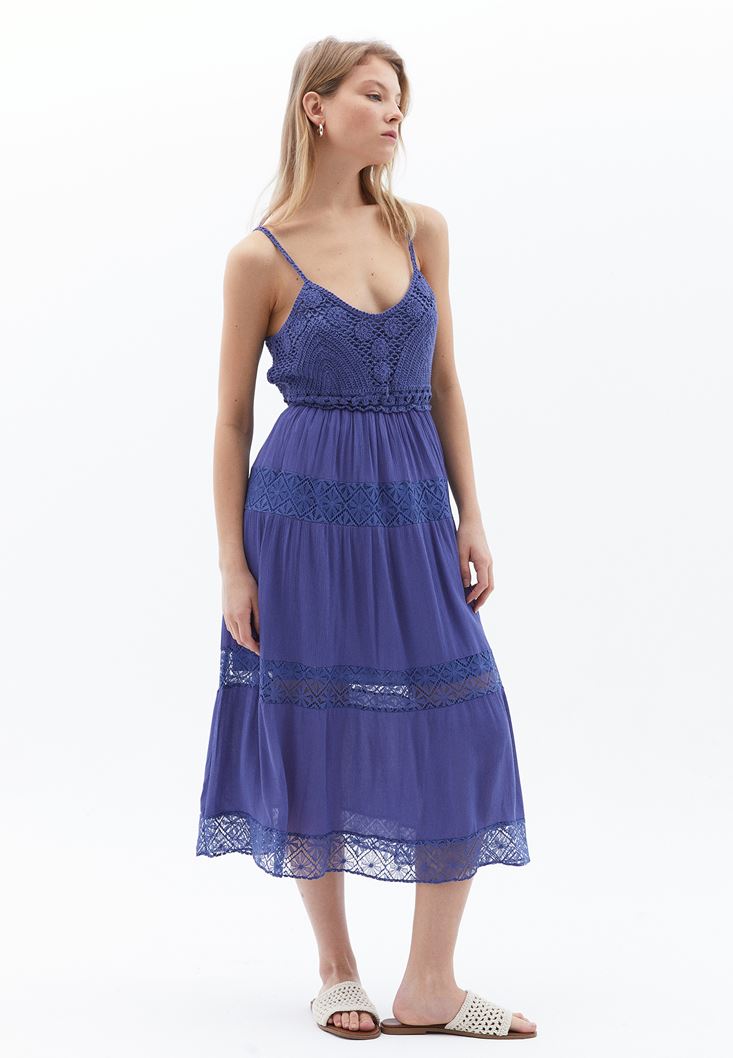 Pamuk karışımlı doku, üst beden kısmı örme detaylı, etek boyunca nakış detaylı, V yaka, ince askılı, bedenden uzak loose fit, içi astarlı, midi boy.