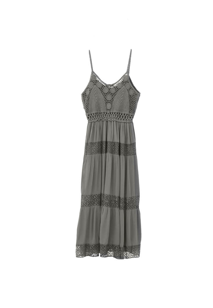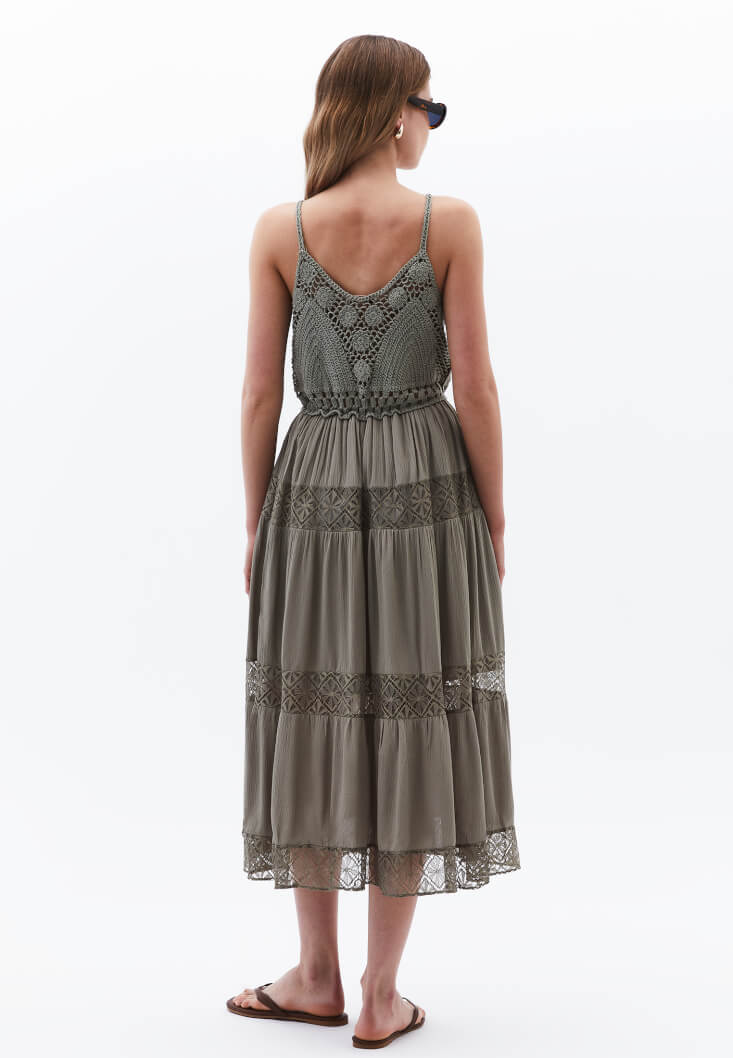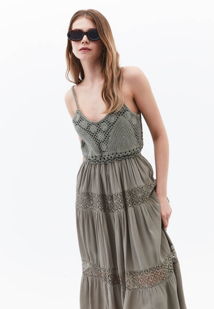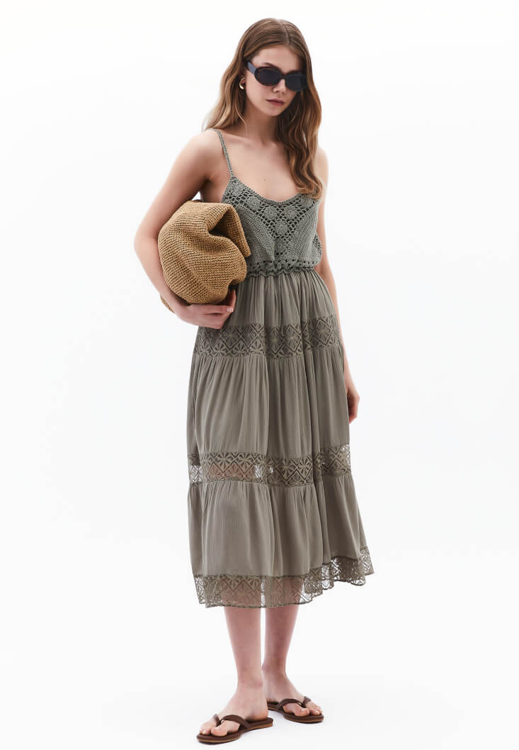 Pamuk karışımlı olan ince askılı midi elbise, yaz akşamlarınıza zarif bir dokunuş katıyor. Üst kısımdaki örme detaylar ve bedenin akışkan kesimiyle feminen bir siluet sunarken, etek kısmındaki nakış işlemeleri sofistike bir hava yaratıyor.