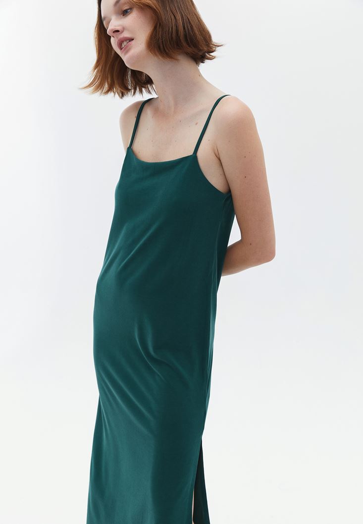 Modal karışımlı özel yumuşak doku, bedene yakın fit, ayarlanabilir ince askılı, geniş yaka, uzun kesim, içi astarsız, yan kısmı yırtmaçlı.