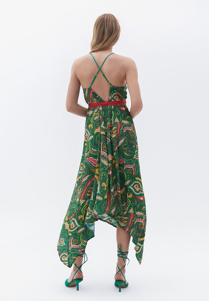 %100 viskon içerikli doğal doku, bohem desenli, V yaka, ayarlanabilir ince askılı, beli bağcık detaylı, asimetrik etek kesimi, bedenden uzak a kesim etek, sırt kısmı V kesim.