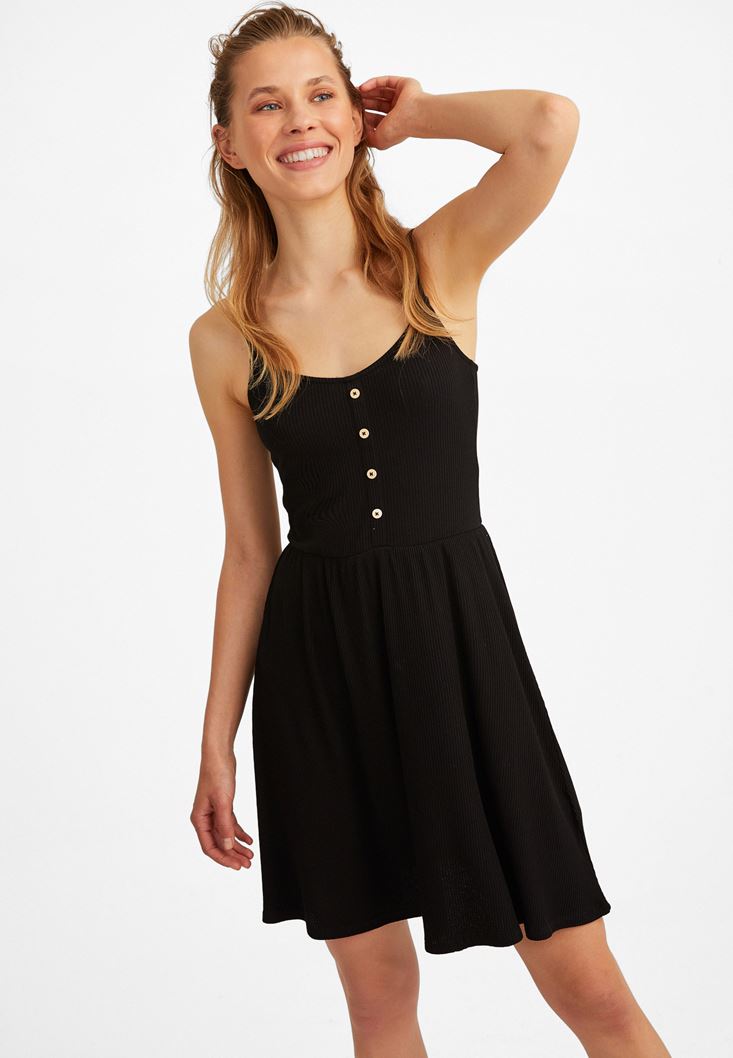 İnce Askılı V Yaka Elbise modeli, viskon içeriğe sahip olan fitilli kumaşı ve sade görünümüyle yeni sezonda sizlere sunuluyor. kadın elbise modeli, V yaka ayrıntısı ve ince askı detayları ile tüm zarifliğini sizlerle buluşturuyor. V yaka elbise modeli, belden oturan kalıbı ve ön tarafında bulunan düğmeleriyle trendler arasında oldukça farklı görünüyor. Sevilen parçalar arasında yerini alan kadın askılı elbise modelini sıcak yaz aylarında sandaletlerle kullanarak rahatlığa ulaşabilirsiniz. Bahar aylarında da tercih edebileceğiniz V yaka elbise modelini ince hırkalarla kombinleyebilirsiniz. Oxxo'nun özgün ve modern detaylarla sizlere sunduğu kadın elbise modelleri ile çok seveceğiniz tarzlar elde edebilirsiniz.