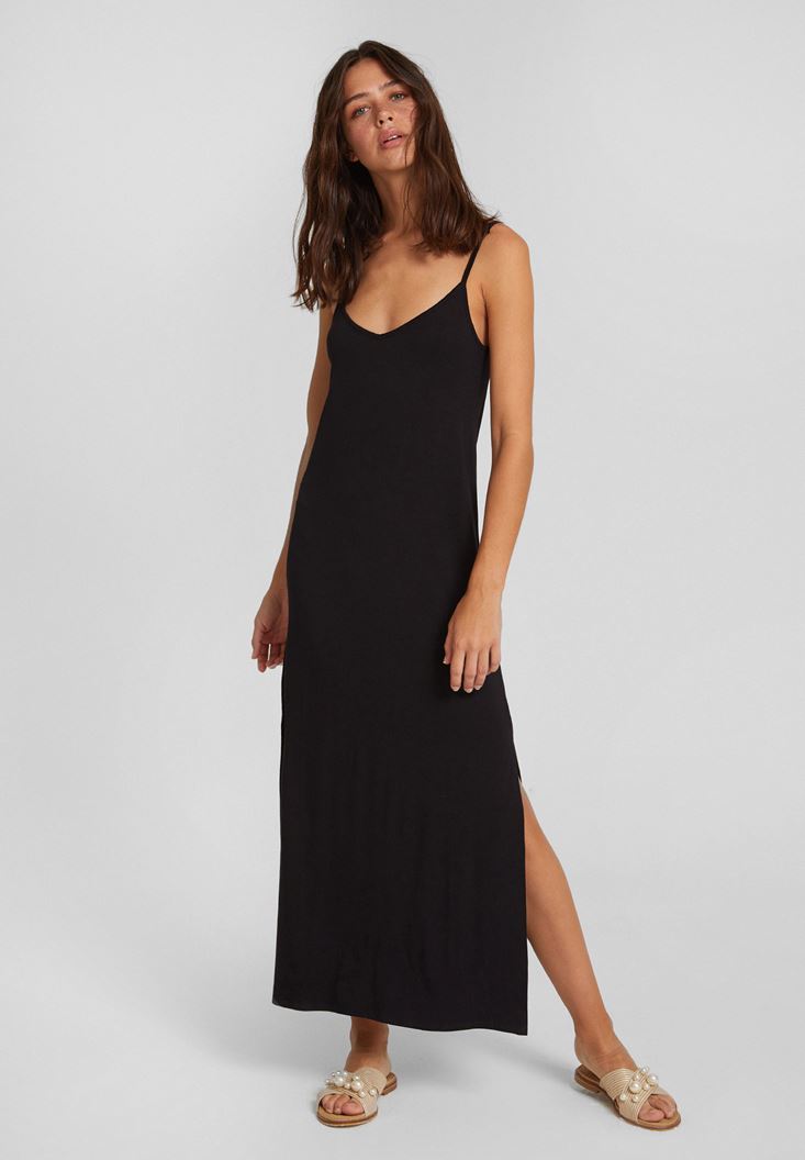 • Bayan Siyah İnce Askılı Yırtmaç Detaylı Uzun Elbise