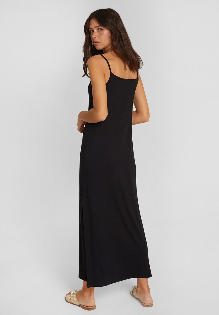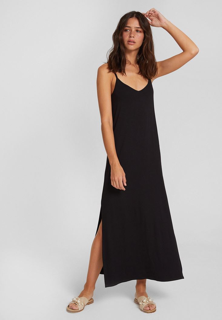 Siyah İnce Askılı Yırtmaç Detaylı Uzun Elbise