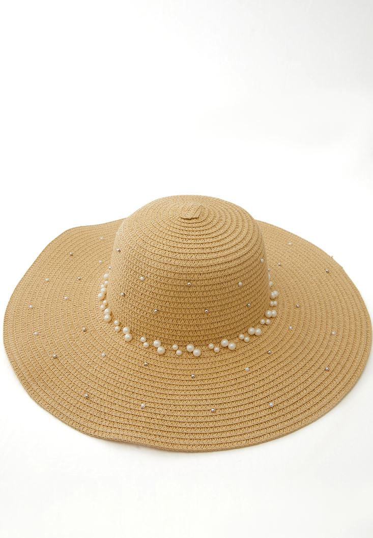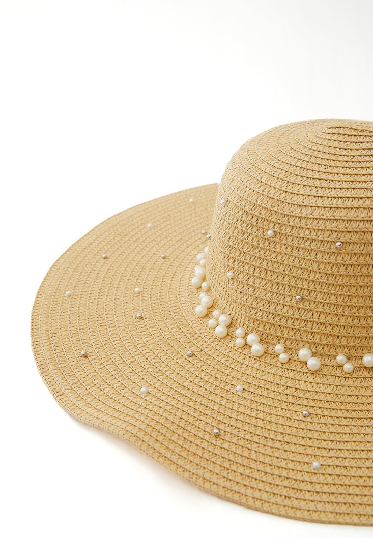 • Bayan Bej İnci Detaylı Hasır Şapka