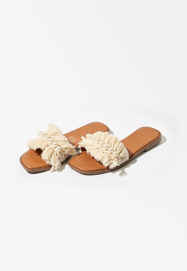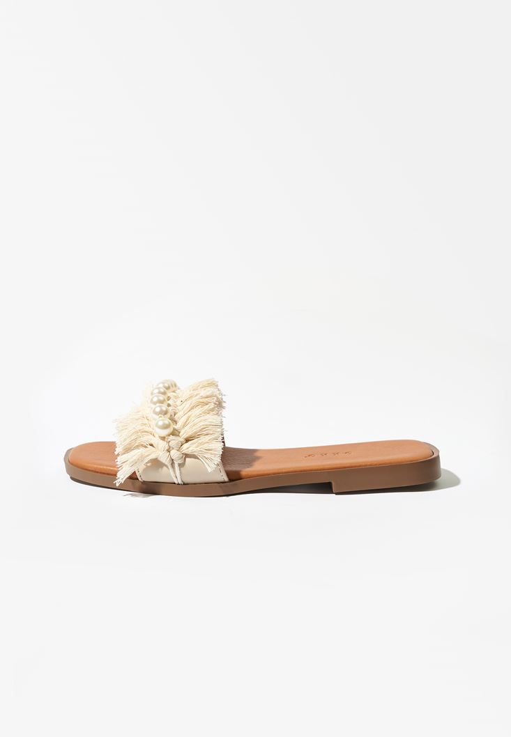 • Bayan Krem İnci Detaylı Makrome Terlik