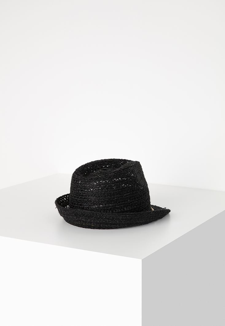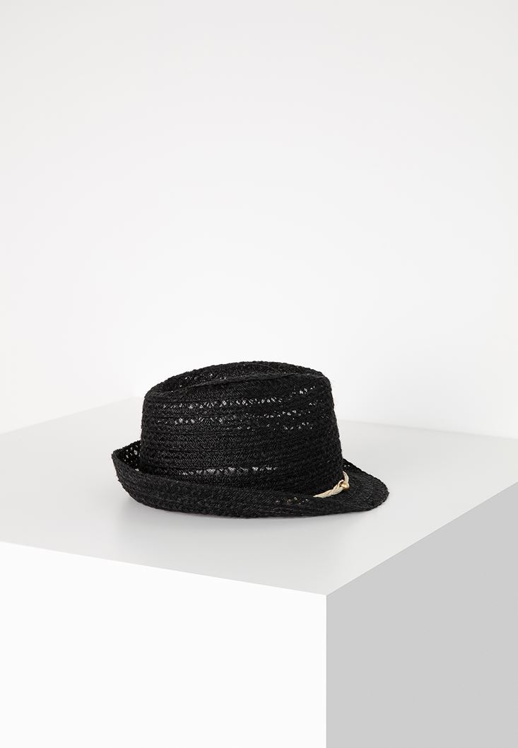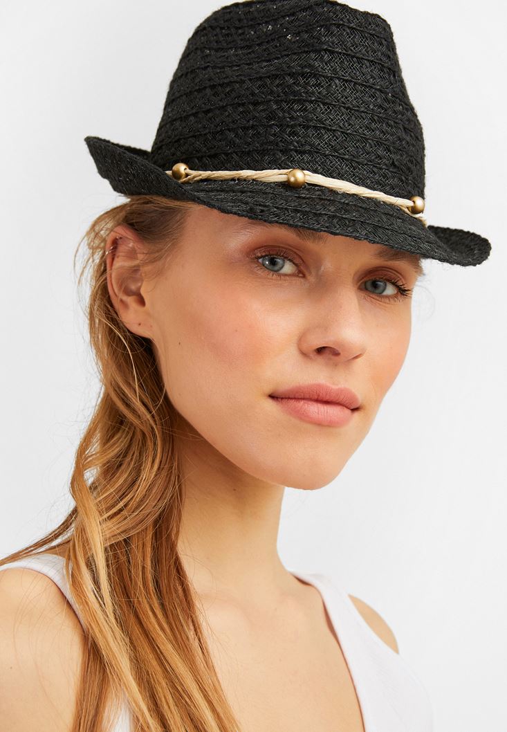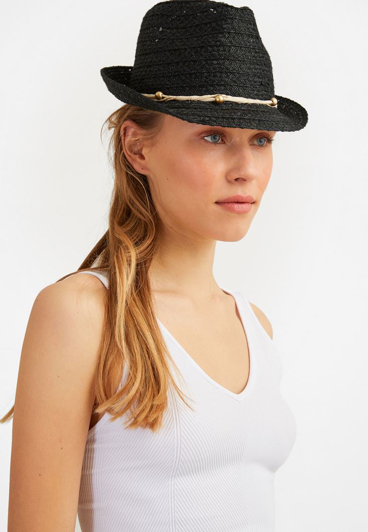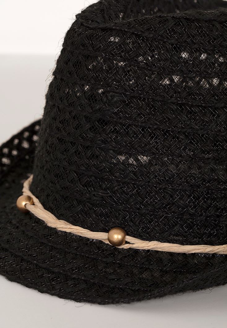 Siyah İp Detaylı Hasır Şapka