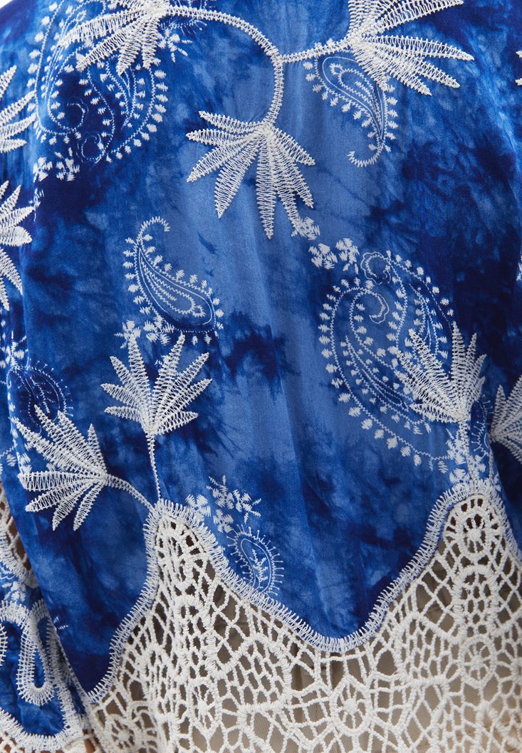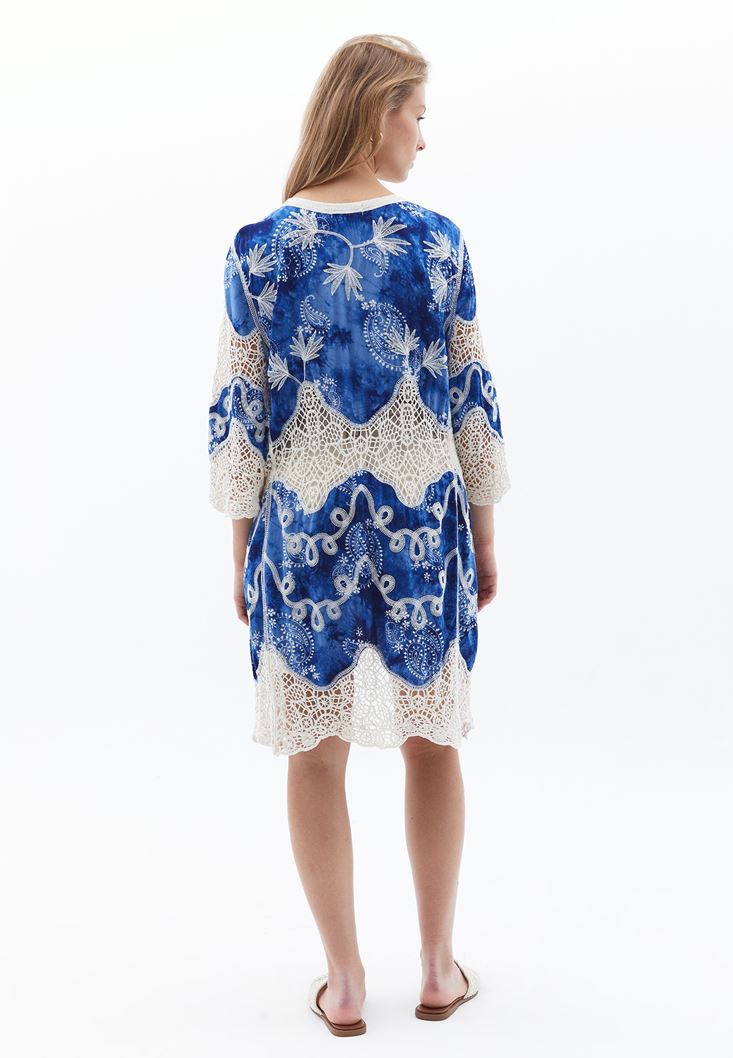 Viskon içerikli doku, motifli nakış detaylı, uzun kesim, bedenden uzak loose fit, yarım kollu, renk geçişli özel doku.