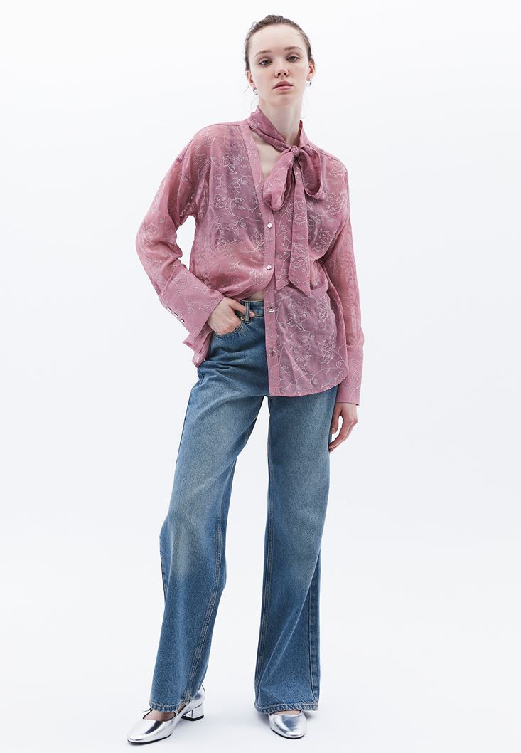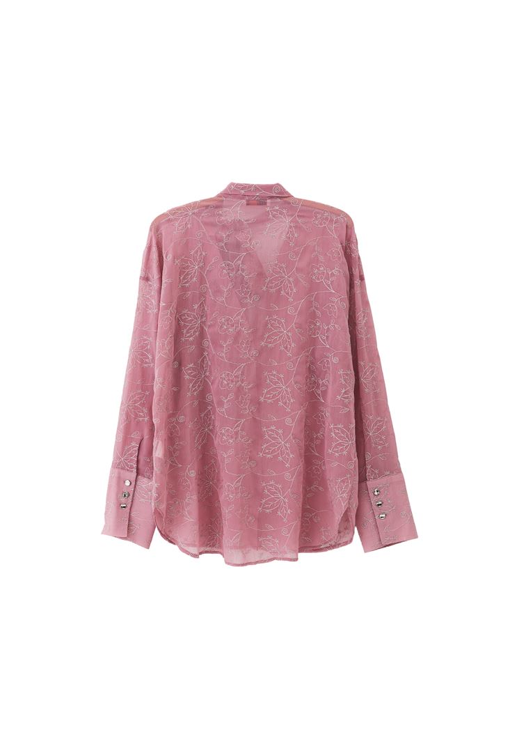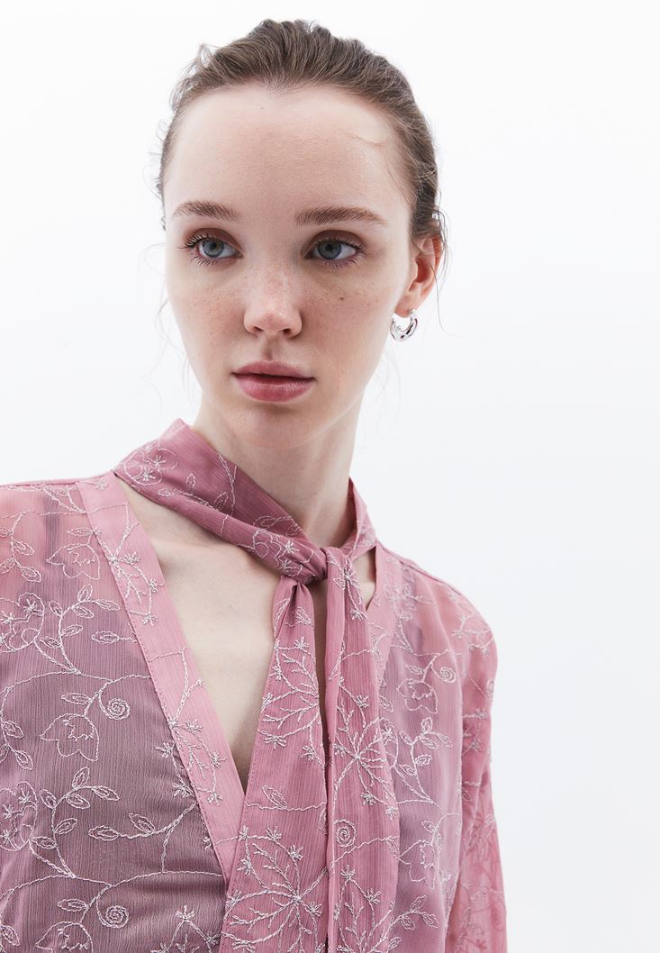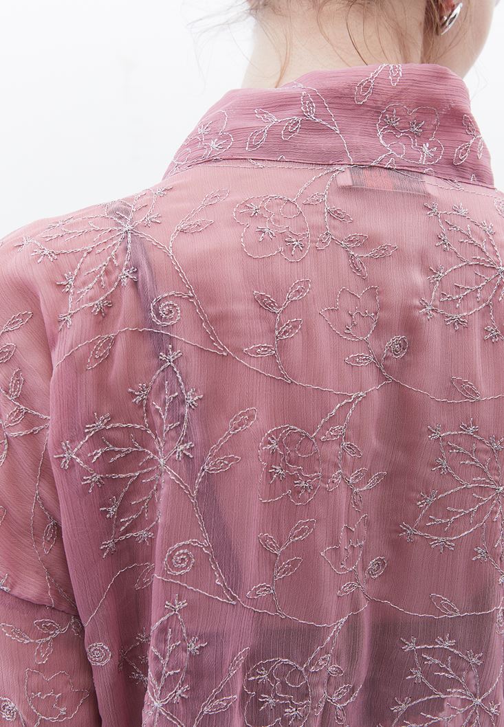 İşleme detaylı transparan doku, bedenden uzak oversize fit, uzun kollu, düğme kapamalı, önü kısa ve arkası uzun asimetrik kesim, boyundan bağlama detaylı.