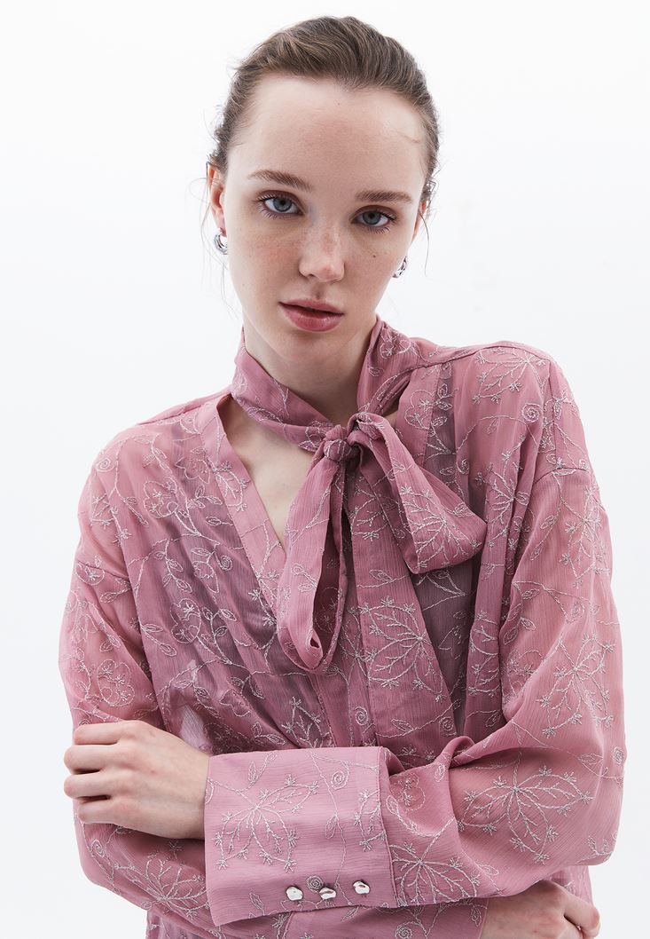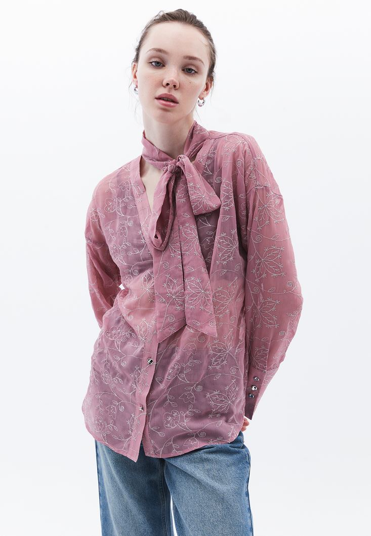 Lila İşleme Detaylı Oversize Gömlek