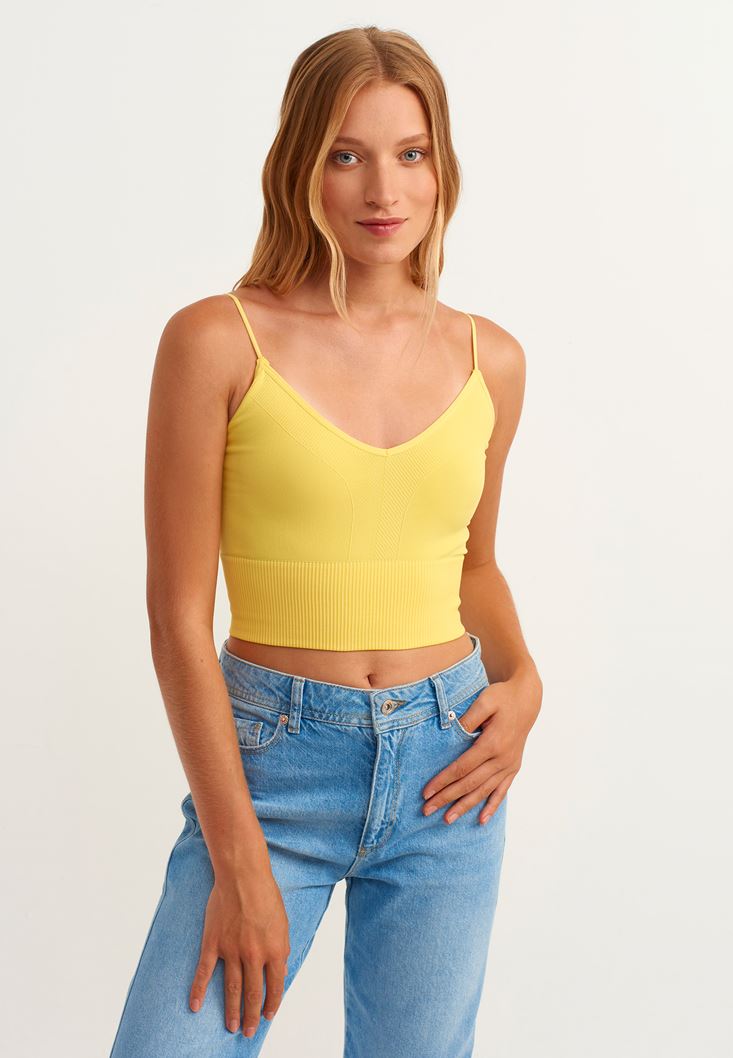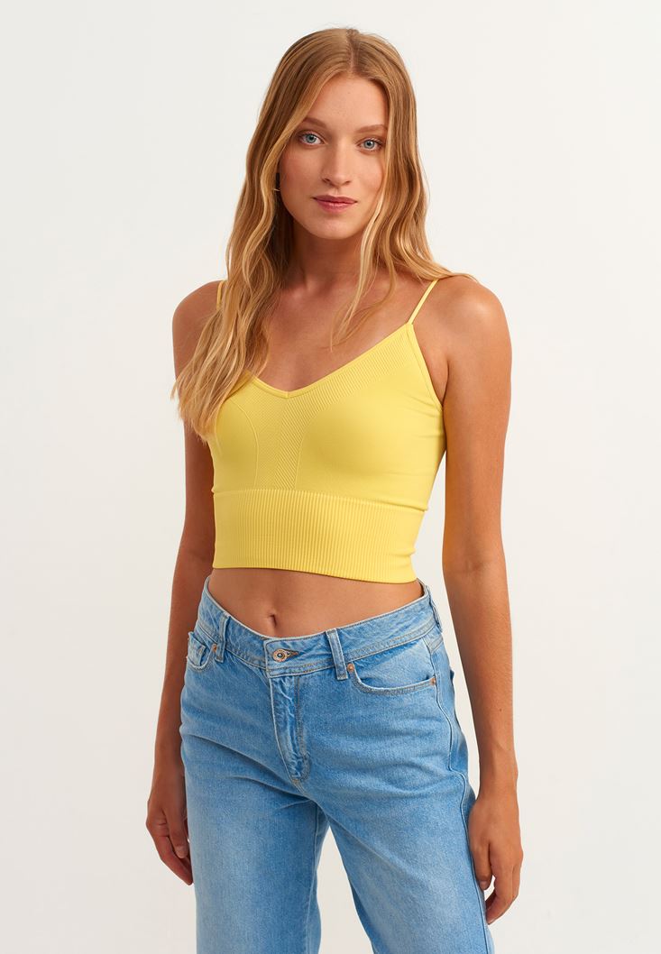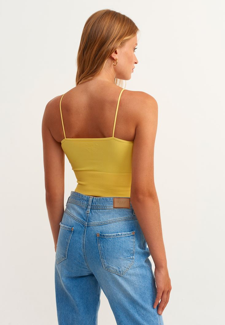 Seamless teknolojisi ile üretilen özel dikişsiz doku, ince askılı, ekstra esnek kalıp, jakar detaylı, crop kesim, bedeni saran rahat form.