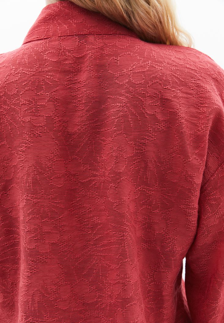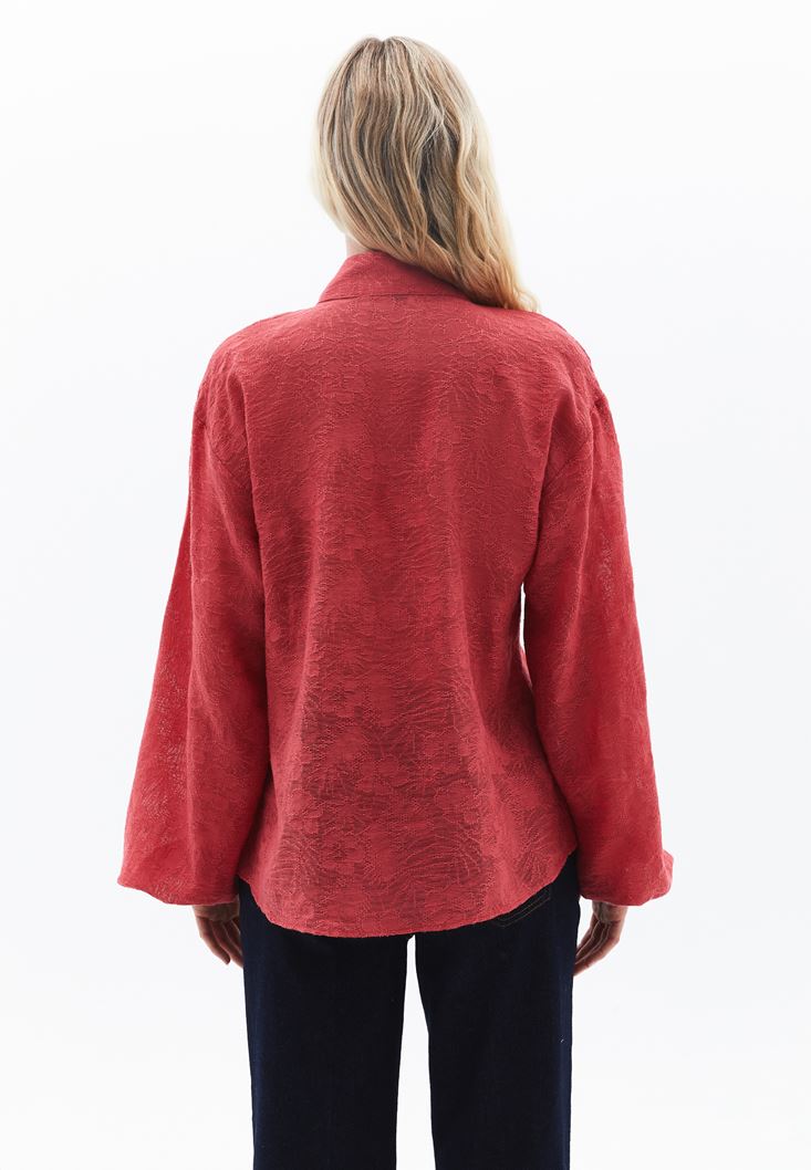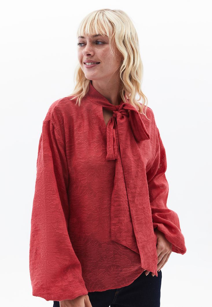 Viskon karışımlı jakarlı doku, uzun kollu, boyundan bağlama detaylı, bedenden uzak loose fit, balon kol tasarım.