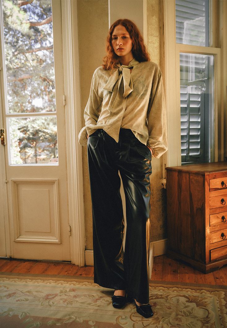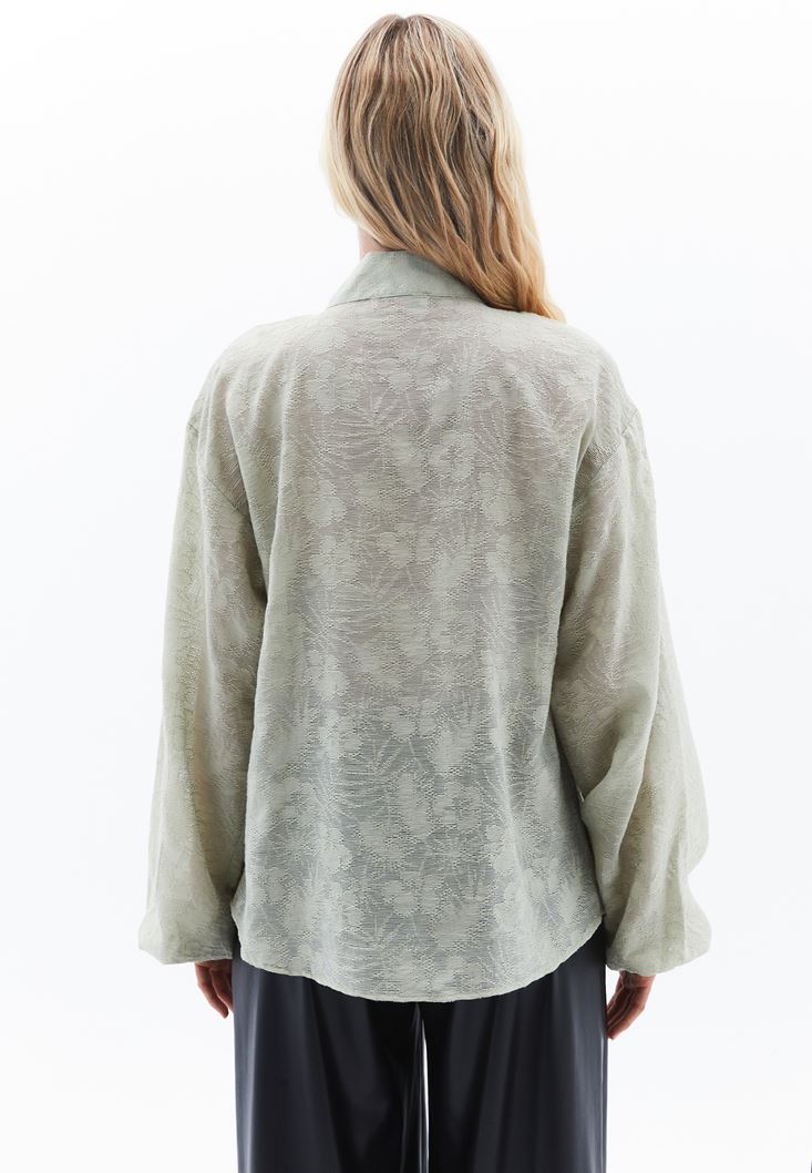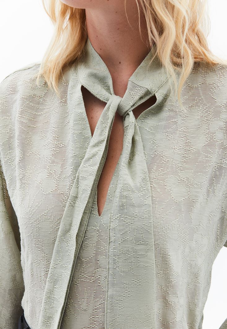 Viskon karışımlı jakarlı doku, uzun kollu, boyundan bağlama detaylı, bedenden uzak loose fit, balon kol tasarım.