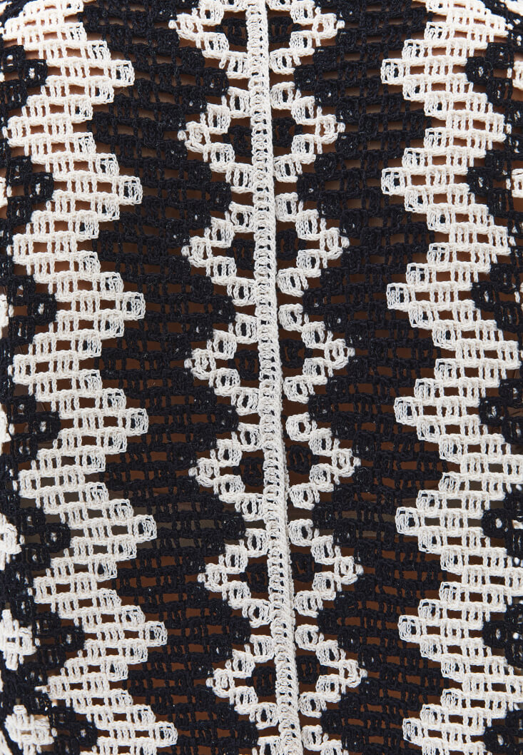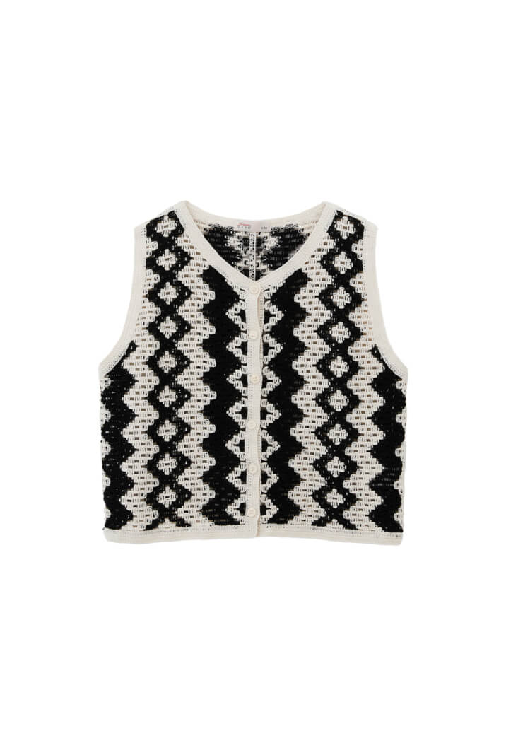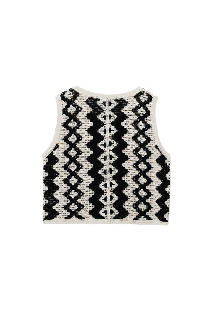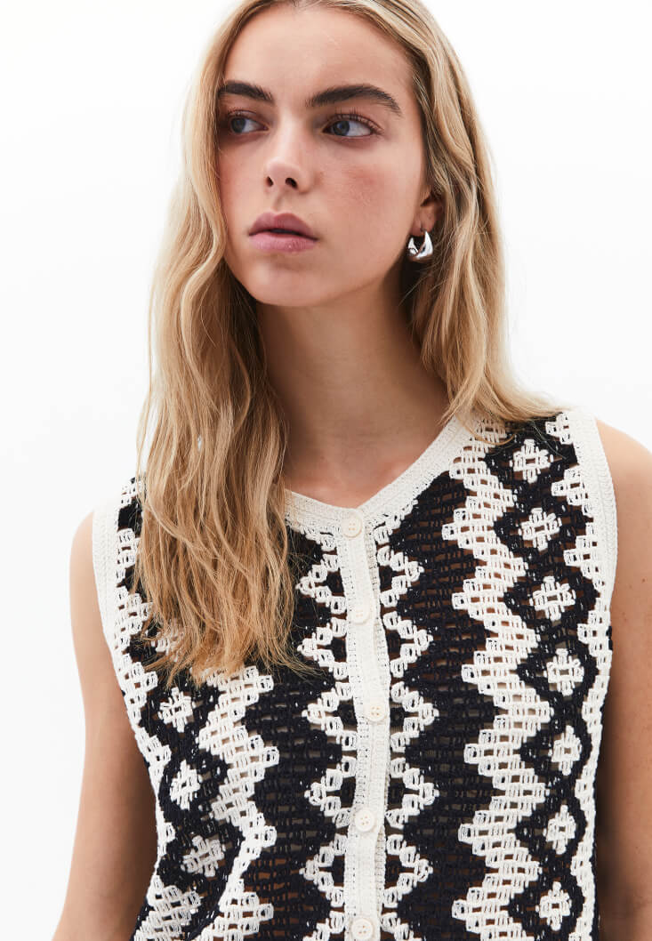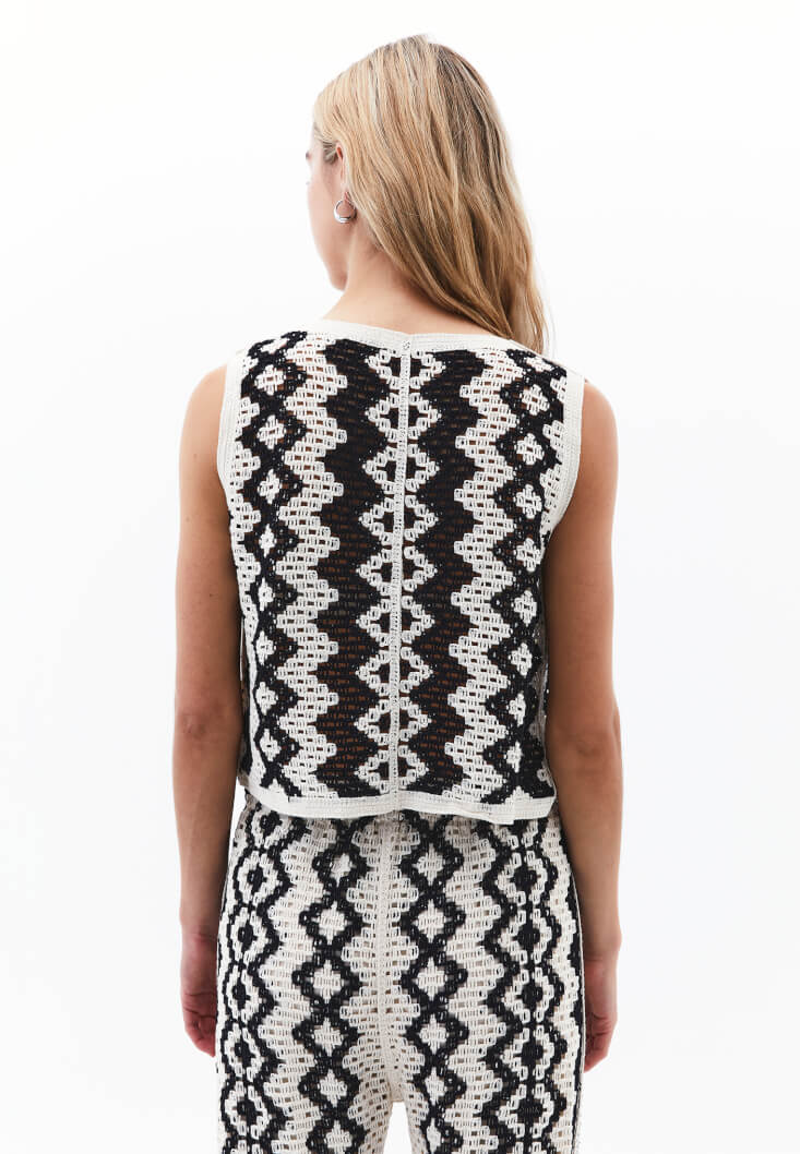 Pamuk karışımlı içerik, ajurlu örgü, geometrik desenli, bedenden uzak loose fit, sıfır yaka, kolsuz tasarım, crop kesim.