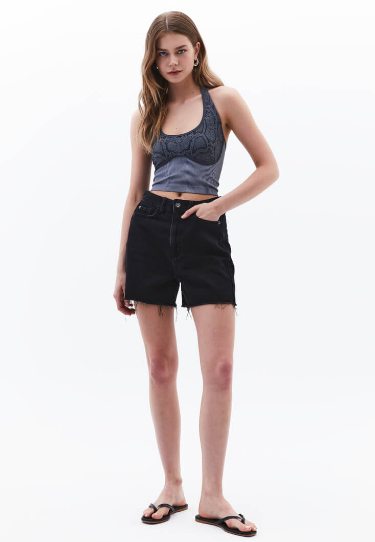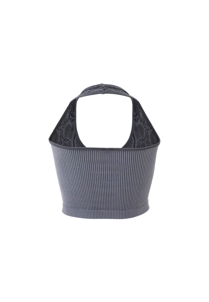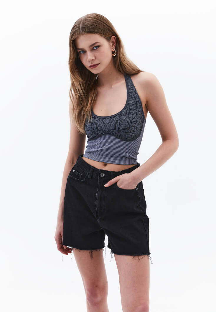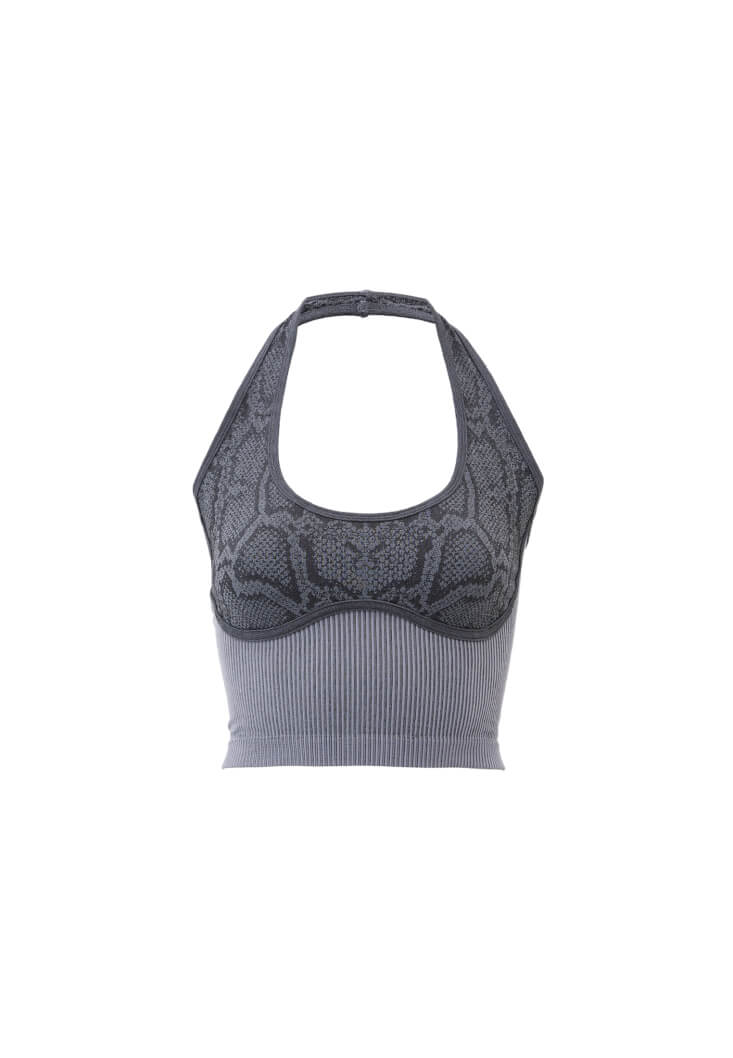 Bedeni saran esnek fit, özel dikişsiz tasarım, göğüs ve askı kısmı desenli, bel ve sırt kısmı jakarlı tasarım, crop kesim, kalın boyundan askılı, U yaka.