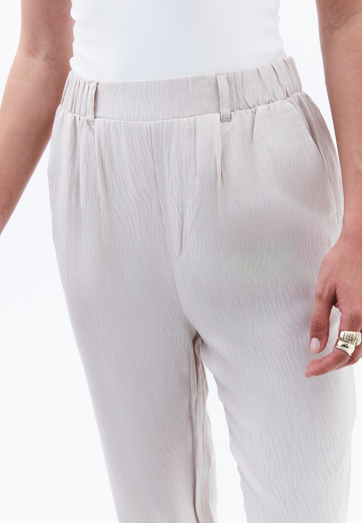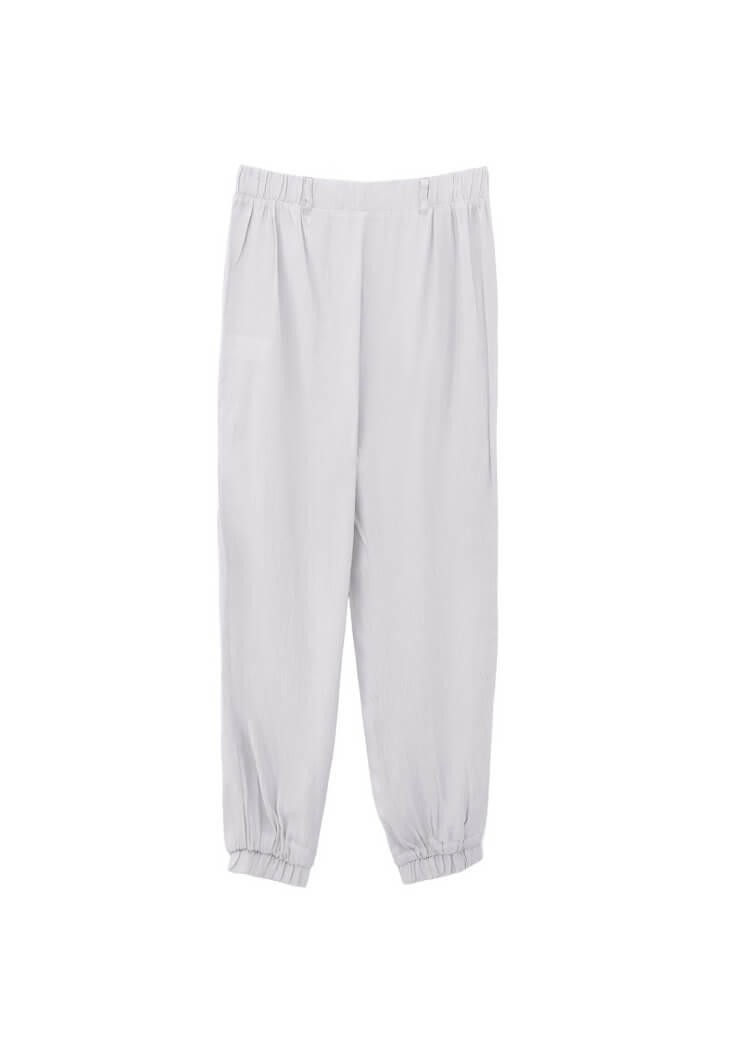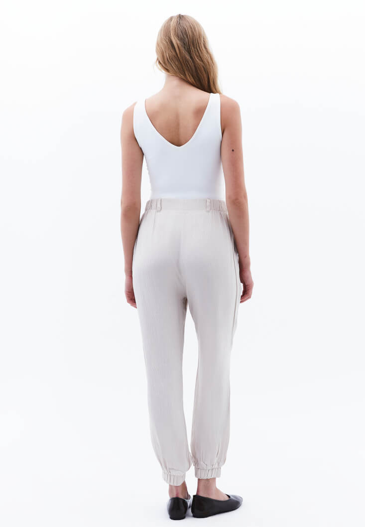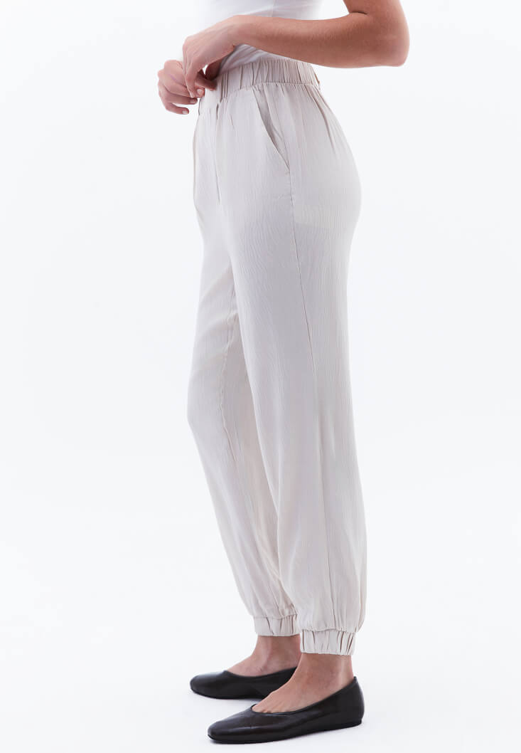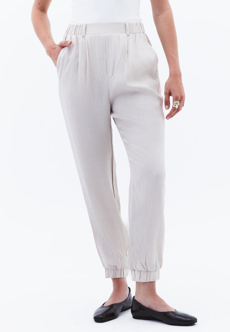 %100 viskon içerikli özel doku, ultra yüksek bel, jogger fit, paçası ve beli lastikli, iki cepli, bedenden uzak rahat fit, bilekte biten paça boyu.