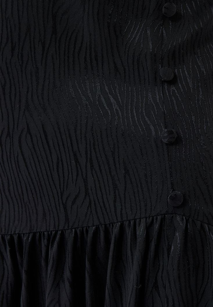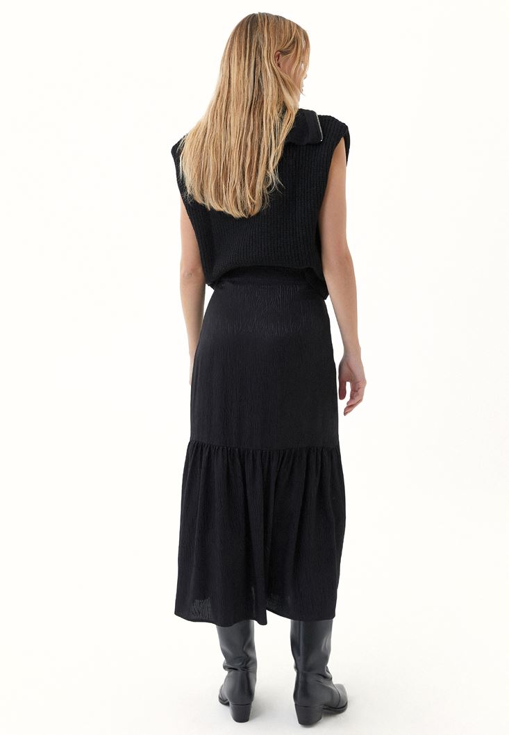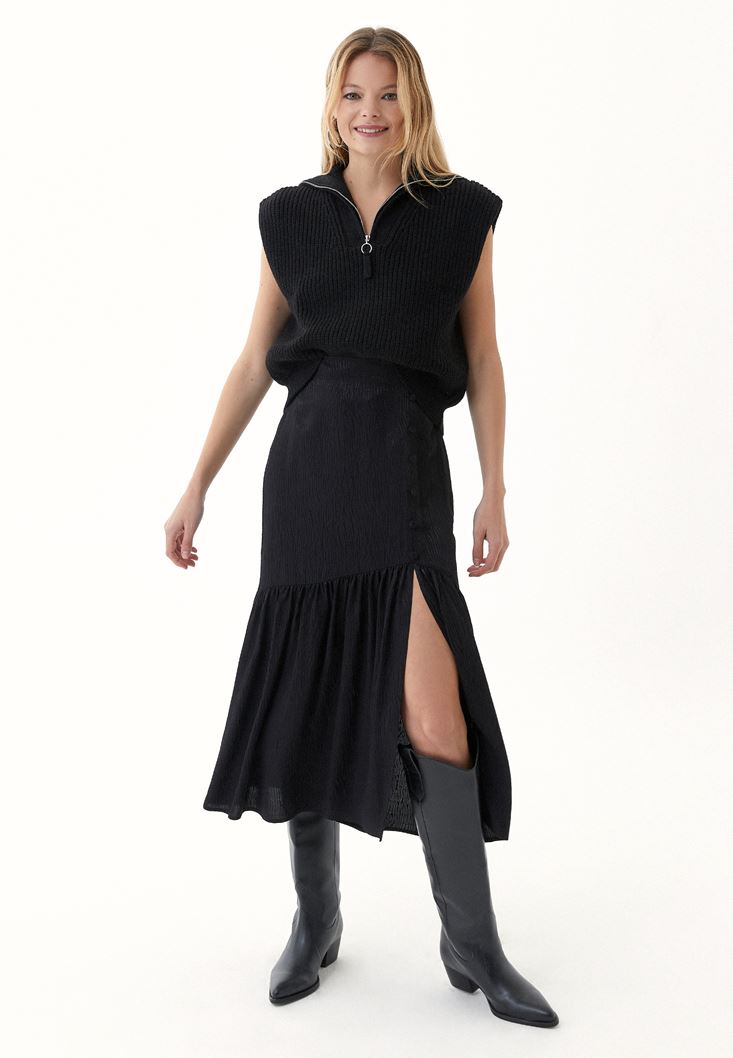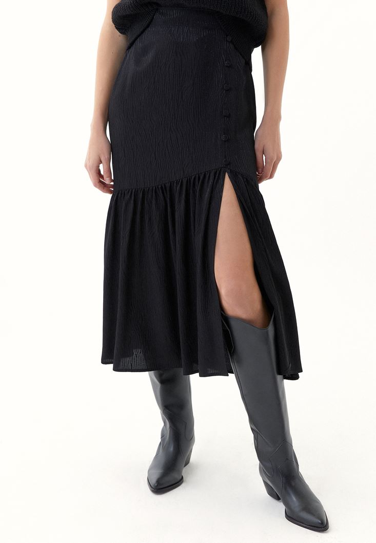 %100 viskon içerikli ve jakarlı doku, yüksek bel, düğme aksesuarlı, tek yırtmaçlı, yırtmaçtan itibaren volanlı, midi boy.