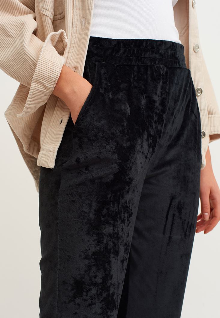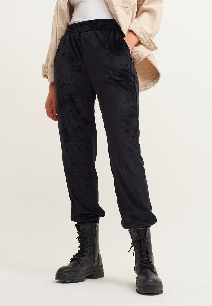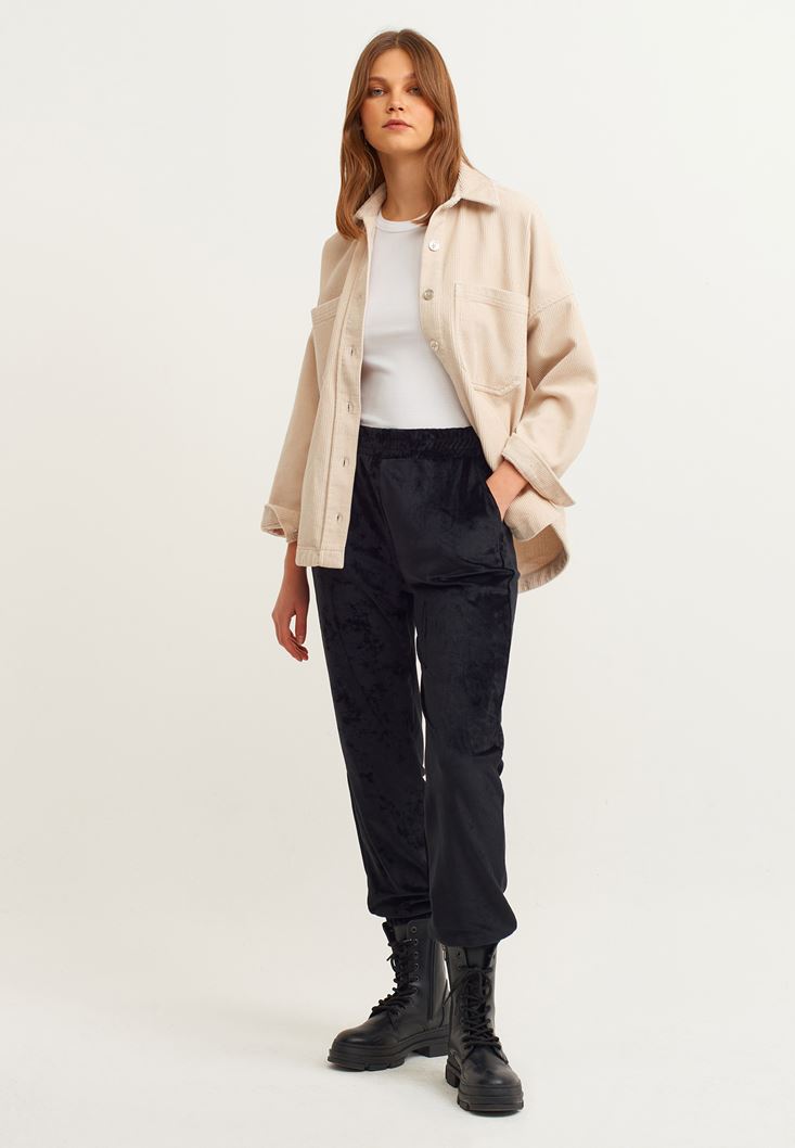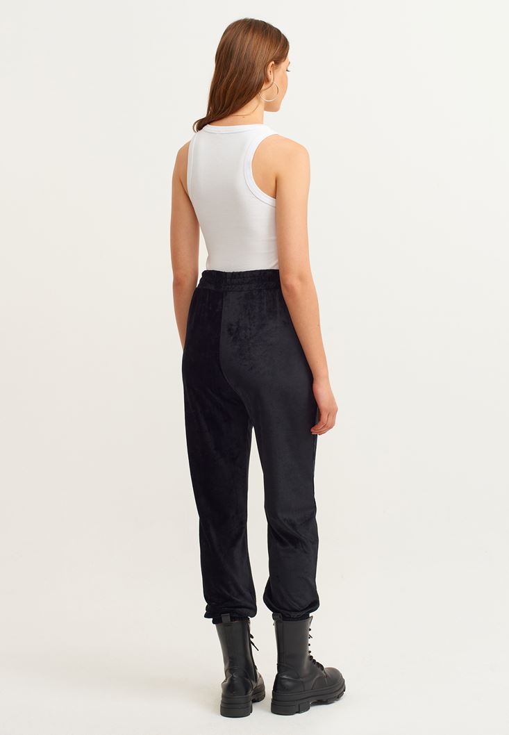 Yumuşak kadife doku, yüksek bel, bedene yakın jogger fit, paçası ve beli lastikli, önü iki cepli, bilekte biten paça boyu.
