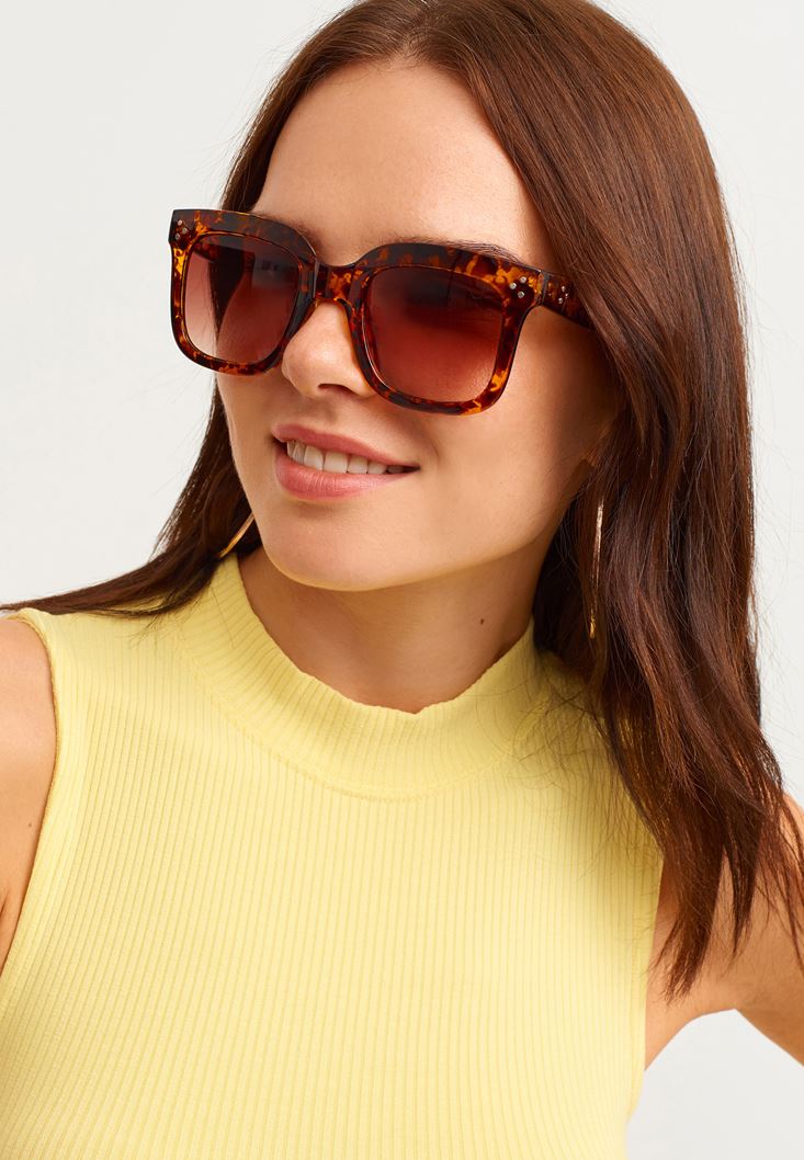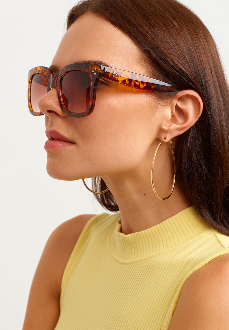Kalın Çerçeveli Güneş Gözlüğü modeli. Geniş çerçevenin vazgeçilmez duruşunu bu parça ile yakalamaya hazırsın... Güneş gözlüğü modelinin desenli çerçeve ayrıntısı sayesinde farklılığa ulaşman an meselesi! Olmazsa olmaz diyebileceğin bu parçayı, sallantılı küpeler ve renkli fularlar ile buluşturarak gününe pozitif ayrıntılar katman mümkün...