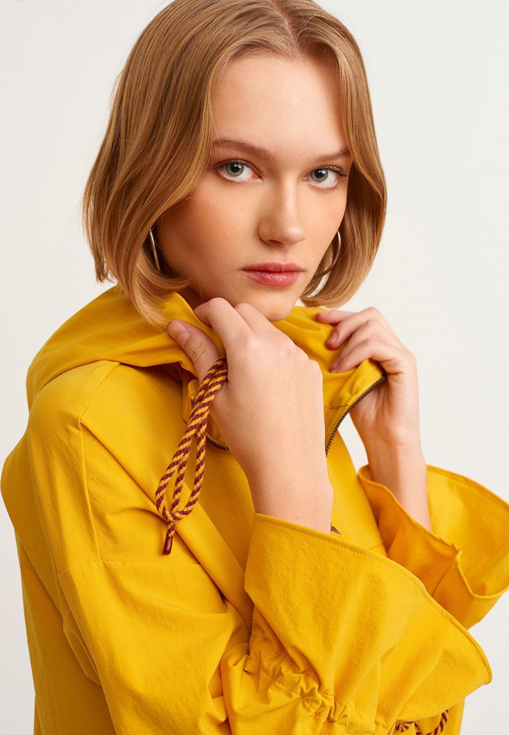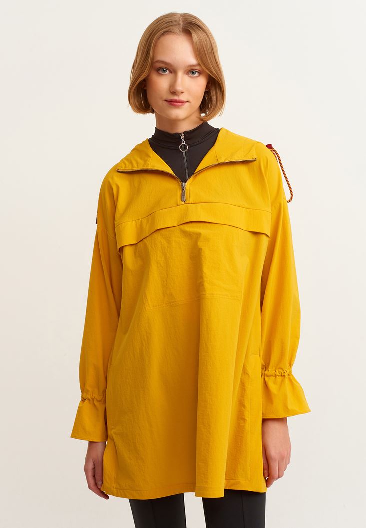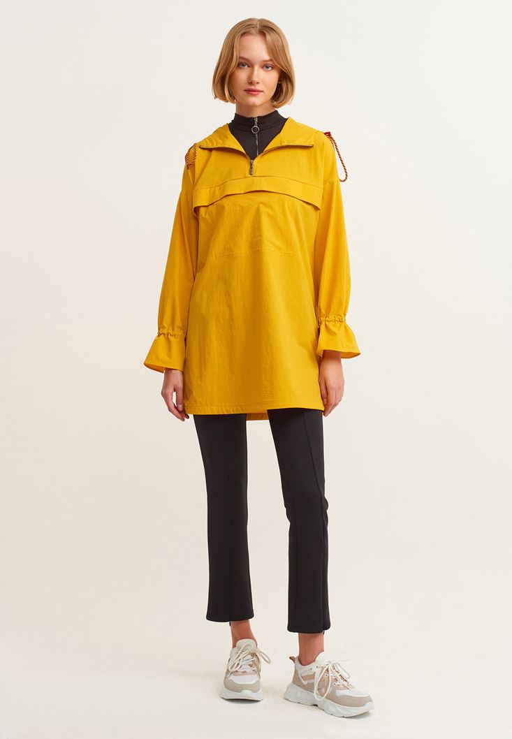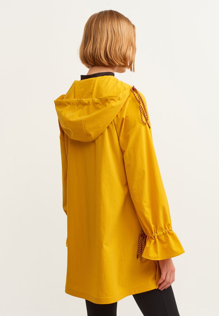 Yağmurlu hava koşullarına özel doku, tunik boy, ayarlanabilir kapüşonlu, yakası fermuar kapamalı, yan kısımları çıtçıtlı yırtmaç detaylı, göğüs kısmı çıtçıt kapamalı cep tasarımlı, kol ucu ayarlanabilir bağcıklı.