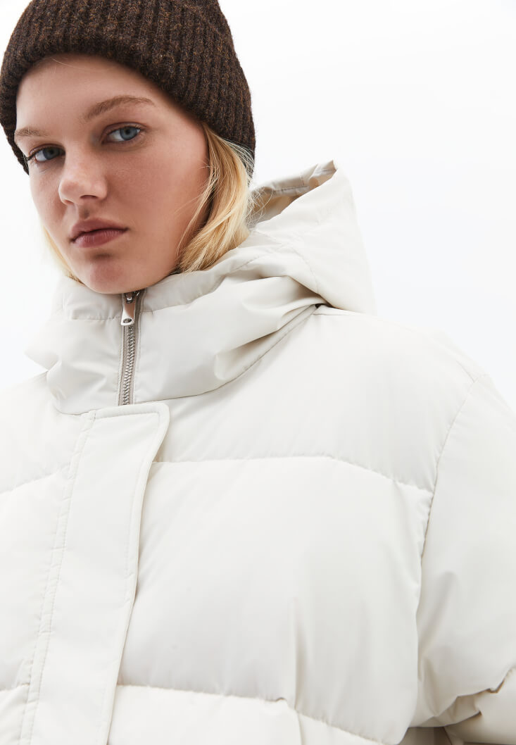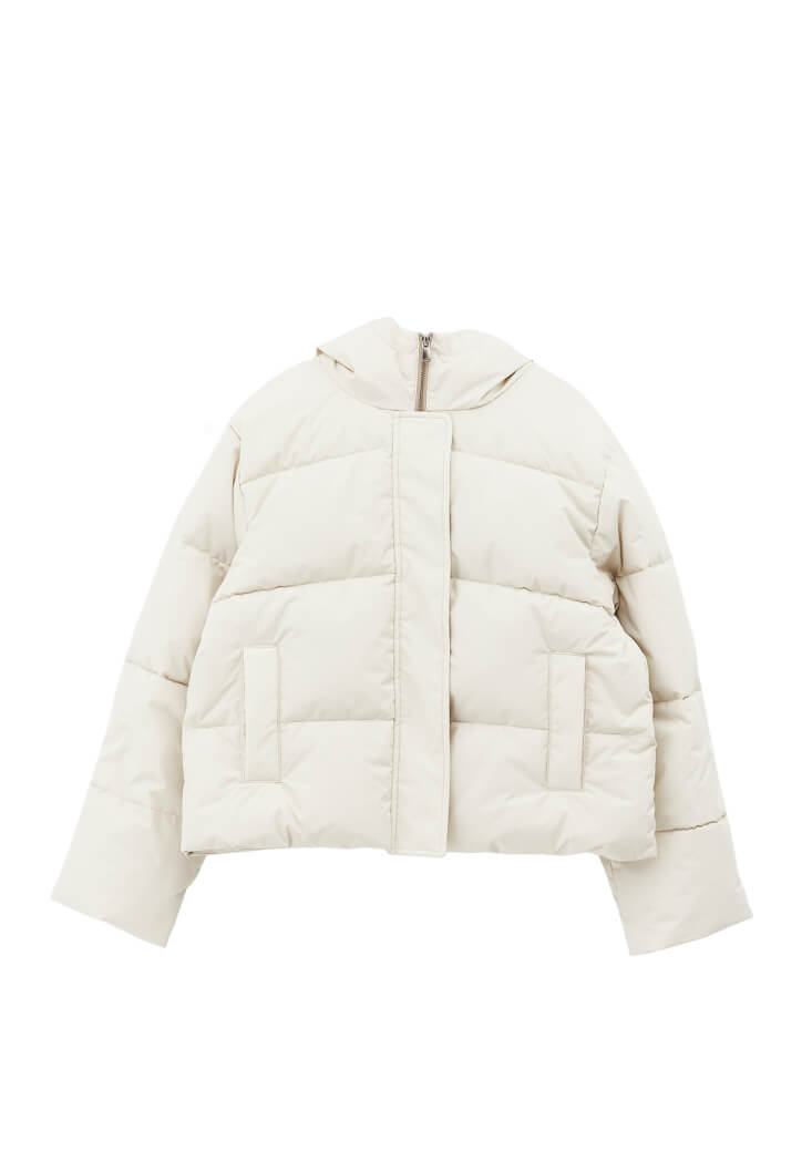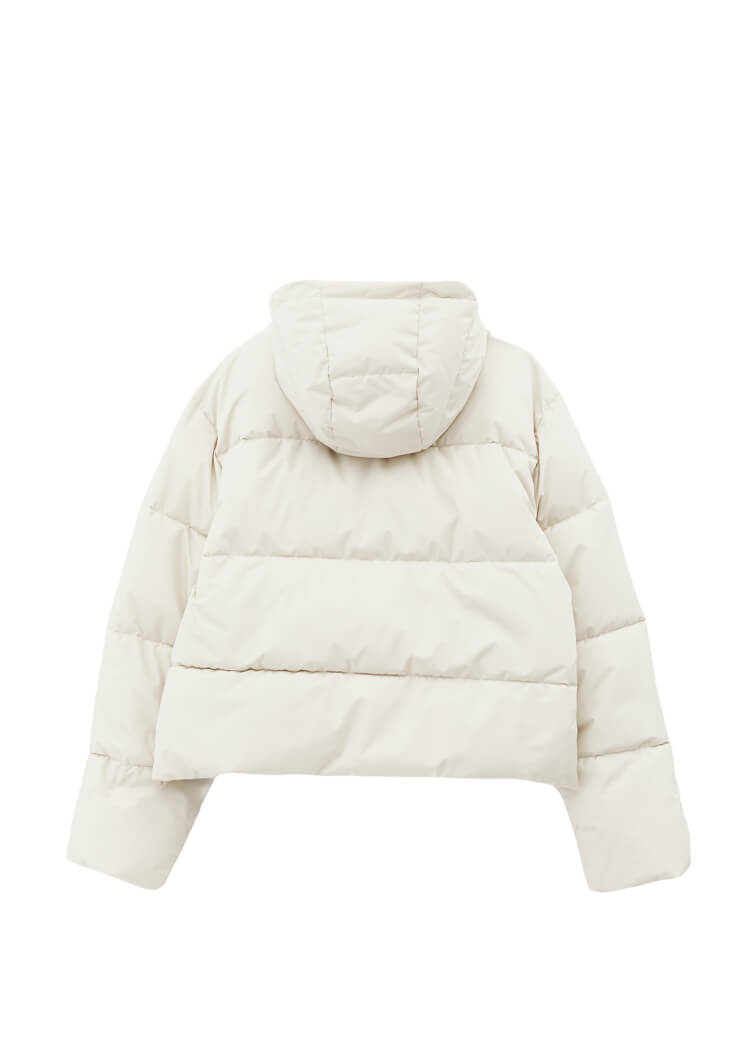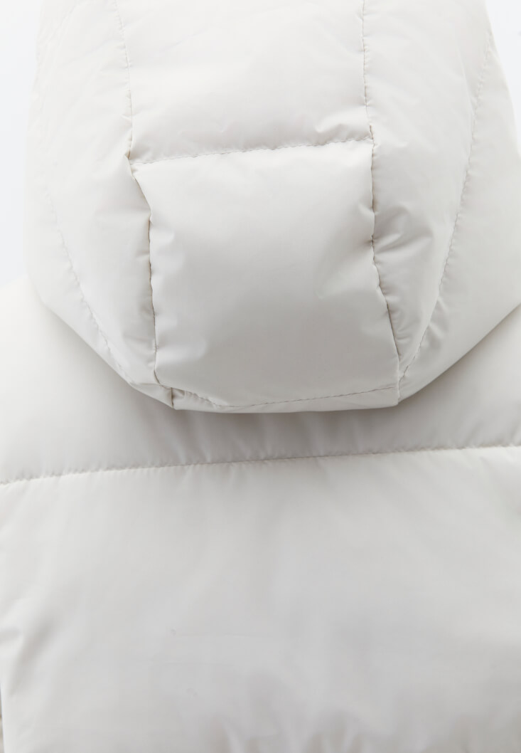 İçi puf dolgulu, kapitone dikişli, özel su geçirmez doku, bedenden uzak loose fit, fermuar ve çıtçıt kapamalı, kapüşon detaylı, yüksek yaka, iki cepli, kol ucu triko lastikli.